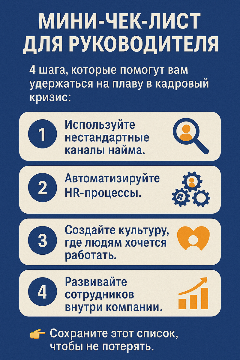 Особенно тяжело обстоят дела в производстве, торговле и транспорте. Чтобы закрыть пробел, правительство планирует привлечь до 1 млн квалифицированных специалистов из Индии. В Екатеринбурге уже открывается консульство, которое будет заниматься именно этим (HR Asia, HRkatha). Иными словами: рынок труда России испытывает острую нехватку кадров. Каждая незакрытая вакансия — это падение скорости работы, рост нагрузки на команду и снижение качества. Причины очевидны: Для руководителей и предпринимателей это означает одно: без новой стратегии найма сотрудников и удержания персонала бизнес будет терять эффективность. Компания в сфере логистики потеряла 30% сотрудников за год.
