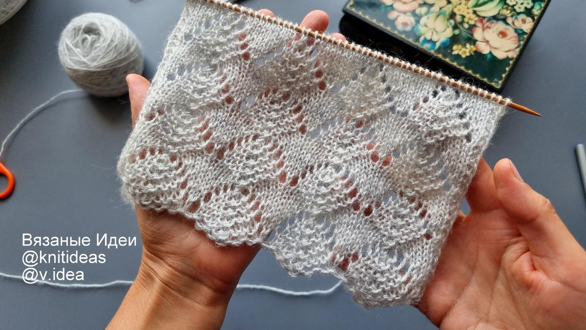 Приветствую Вас на канале Вязаные Идеи! Сегодня рассмотрим красивый несложный узор спицами. Один раппорт этого узора можно применить в качестве каймы. Внимание! При копировании и публикации моих материалов на других ресурсах указывайте активную ссылку на источник: канал Вязаные Идеи Раппорт 12 петель и 10 рядов Для вязания поворотными рядами наберите количество петель кратное 12 +1 п+2 кром. Количество петель кратно 12 +1 +2 кром 1 ряд: кром, *1 лиц, накид, 4 изн, 3 вм. изн, 4 изн, накид*, 1 лиц, кром 2 ряд и все четные ряды вязать изнаночными петлями 3 ряд: кром, *2 лиц, накид, 3 изн, 3 вм. изн, 3 изн, накид, 1 лиц*, 1 лиц, кром 5 ряд: кром, *3 лиц, накид, 2 изн, 3 вм. изн, 2 изн, накид, 2 лиц*, 1 лиц, кром 7 ряд: кром, *4 лиц, накид, 1 изн, 3 вм. изн, 1 изн, накид, 3 лиц*, 1 лиц, кром 9 ряд: кром, *5лиц, накид, 3 вм. изн, накид, 4 лиц*, 1 лиц, кром Повторять с 1 по 10 ряд Также этот узор можно вязать по кругу. Для вязания нужно набрать количество петель кратное 12 и вязать по схем