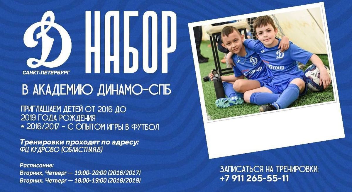 Открываем набор в филиал в Кудрово! Приглашаем юных футболистов стать частью большой Динамовской семьи в ФЦ «Кудрово». Возрастные группы: 2016/2017 - с опытом игры в футбол 2018/2019 - без опыта игры в футбол Расписание: Вторник, четверг — с 18:00 до 19:00 (2018/2019) Вторник, четверг — с 19:00 до 20:00 (2016/2017) По всем вопросам: +79313458663