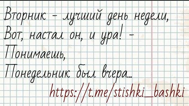 Про самый лучший день #неделя #вторник #стишкиизбашки Стишок каждый день для настроения @stishki_bashki 📹 - видеостишки тут 👈 🙊 - а тут можно комментировать 👈 Поделитесь стишком с друзьями