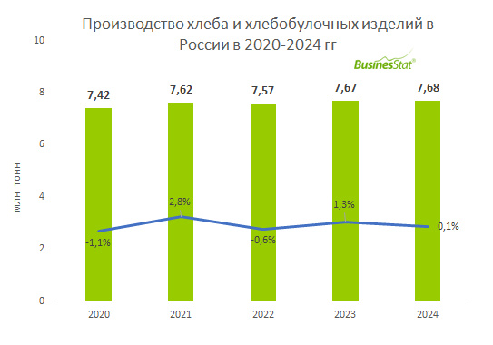 В 2024 г производство хлеба и хлебобулочных изделий в России осталось на уровне предыдущего года – 7,68 млн т.
