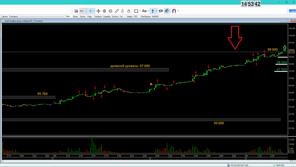 #Евро (Eu-9.25) Рынок пока продолжает очень медленно расти, но по всему видно, что на фоне перманентной медвежьей ликвидности даётся ему это всё тяжелее Здесь давно созрел как минимум локальный медвежий сценарий, вопрос только в том, когда он начнётся... Резюмирую. В моменте возможно цена поднимется ещё выше, но работать от лонга по-прежнему очень рискованно. Первые потенциальные цели в краткосрочной перспективе — уровни 98 500, 98 000, 97 500