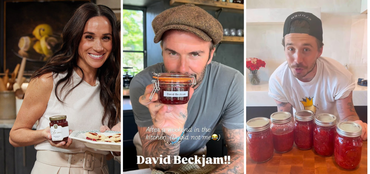 Стало известно, что забавное видео Бекхэмов, в котором Дэвид варит джем, также является ироничной насмешкой над их сыном Бруклином и намеком на то, что Бекхэмы "раздражены" Меган Маркл и принцем Гарри. Бывший капитан сборной Англии примерил на себя образ герцогини Сассекской и превратил сливы из своего сада в Котсуолдсе в консервы. Его жена сняла его на видео и даже пошутила о его "сочных сливах", а затем громко рассмеялась, когда он показал ей банку с надписью "Дэвид БекДжем". Это произошло всего неделю спустя после того, как их сын Бруклин, с которым Дэвид и Виктория давно не общались, дал своим подписчикам в социальных сетях урок по приготовлению джема. Ну и все мы помним, что в основе продуктов Меган Маркл от ее бренда As Ever - джем, который она называет "фруктовый спред"; недавно она также представила покупателям апельсиновый мармелад. Источник, который много лет тесно сотрудничал с Викторией, сообщил, что участие миссис Бекхэм в сценке Дэвида - не случайность: - У Виктории очень