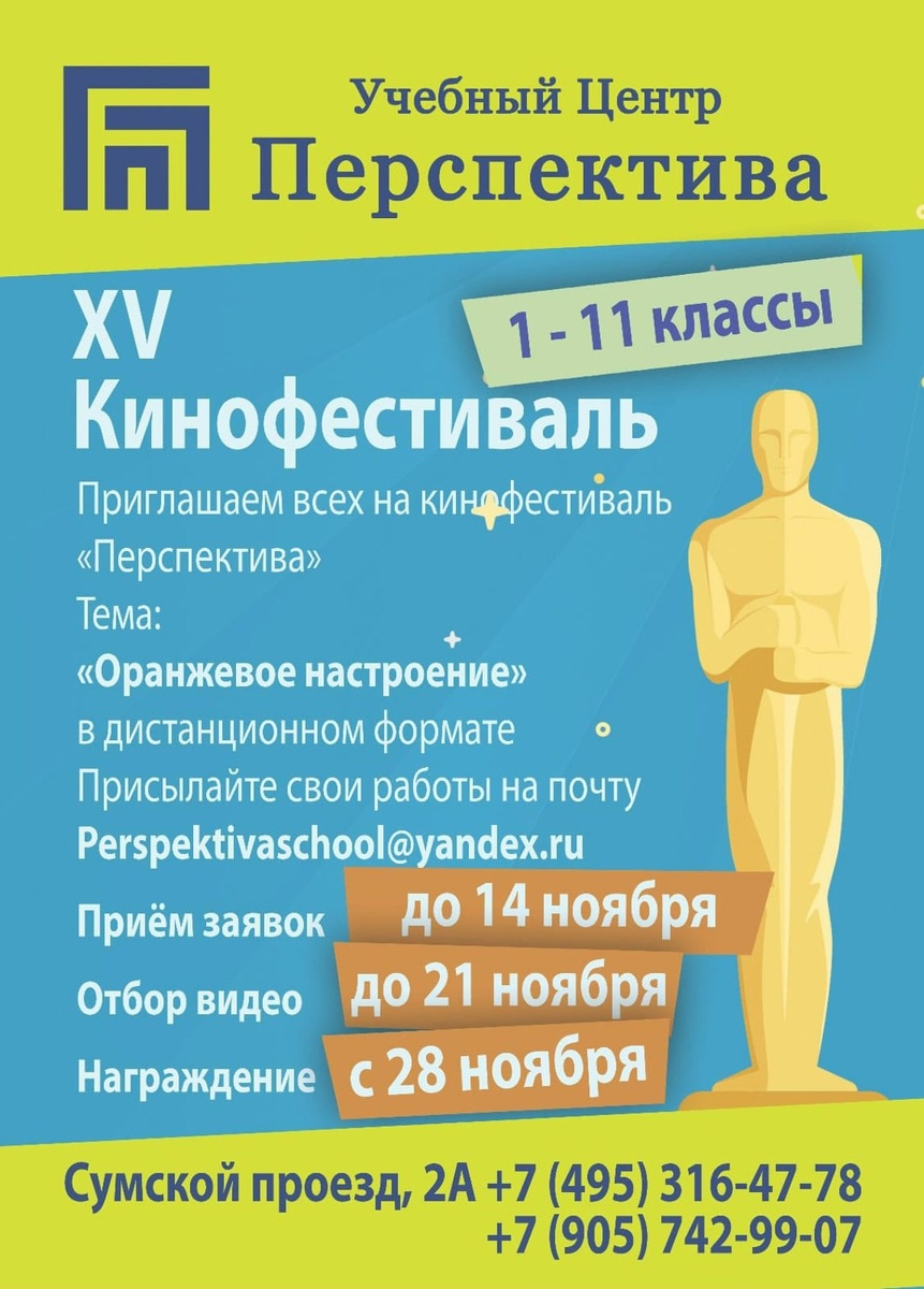 Уважаемые коллеги и школьники!🏫 Общеобразовательная автономная некоммерческая организация «Учебный центр «Перспектива» приглашает вас принять участие в нашем 15 кинофестивале "Оранжевое настроение"🎥🦊 Принимаем работы до 14 ноября Отсмотр работ,итоги до 21 ноября Награждение с 28 ноября Наш кинофестиваль - это место для тех, кто любит кино и верит в то, что каждый ребенок талантлив и ему есть, что сказать миру посредством кинематографа. Кинофестиваль призван найти и открыть миру талантливых актёров, режиссеров, сценаристов, операторов, сформировать оригинальные творческие коллективы и киностудии Конкурс проводится в дистанционном формате. На конкурс принимаются видеофильмы, созданные учащимися под руководством педагогов видеостудий. Контактная информация: ОАНО «УЦ «Перспектива» г. Москва, ул. Сумской проезд 2а 8(495)316-00-74, 8(495)316-47-78 8(905)7429907 Заявки на участие в фестивале и видеоматериалы принимаются по адресу: kap-ri@mail.ru с пометкой «Кинофестиваль» Ждём