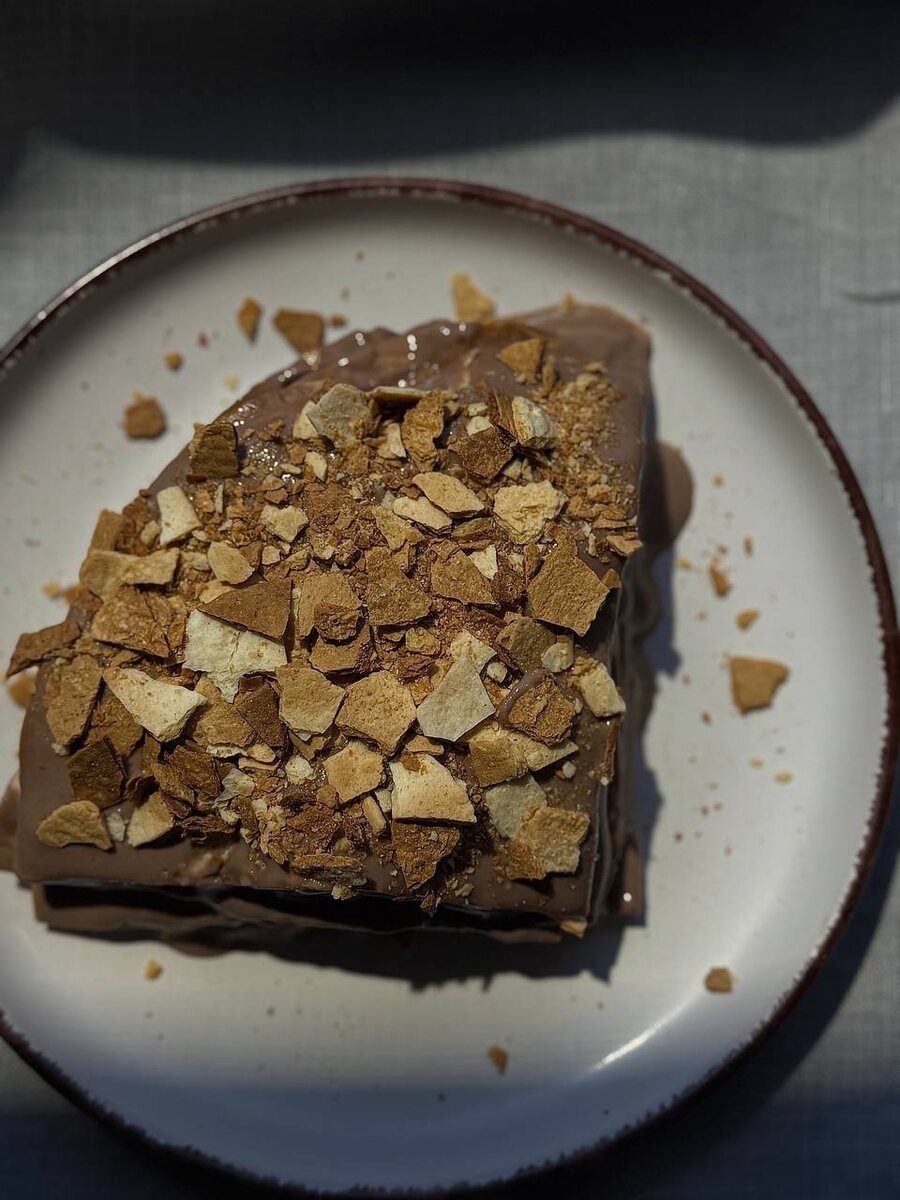 Пп торт из тортильи и пудинга Лист тортильи 2 шт. Греческий йогурт 1 уп. Пудинг шоколадный без сахара 1 уп. Подсластитель (сироп топинамбура) 2 ст.л. Разрезаем листы тортильи на 4 части и оправляем в духовку на 5-10 минут при температуре 180 градусов до золотистого цвета. Для крема смешиваем: греческий йогурт,пудинг и сироп топинамбура. Хорошо перемешиваем. Собираем торт. Сухой корж смазываем кремом и накрываем следующим коржом. И так раз за разом. Завершаем сбор торта - смазываем кремом весь торт и присыпаем сухой крошкой из сухого листа тортильи. Оставляем настояться до 2 часов в комнатной температуре. Готово ☑️ #вкусно#пп#торт#безсахара#безвреда