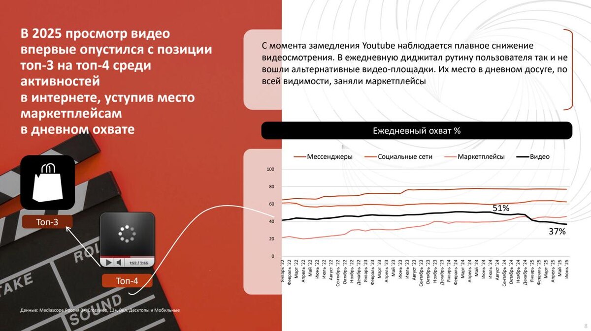 📊 Маркетплейсы стали популярнее видеосервисов В первом полугодии 2025 года маркетплейсы впервые обогнали онлайн-видео на видеохостингах по среднедневному охвату. Об этом Sostav сообщили в digital-агентстве Future Lab (входит в Starlink). Что это значит для брендов? ➡️ Маркетплейсы — высокочастотная среда. Баннеры, ленты, витрины, видеостоки внутри приложений работают как носители имиджа и видимости. ➡️ Кросс-форматность: совмещение медийных блоков с Sponsored Products/Brands и визуальной полкой усиливает узнаваемость. ➡️ Адаптация к «скролл-потреблению»: креатив должен быть коротким, визуально чистым и запоминающимся в условиях 10−15 минутных ежедневных сеансов. 😀 Пожалуй, лучший телеграм-канал о маркетинге