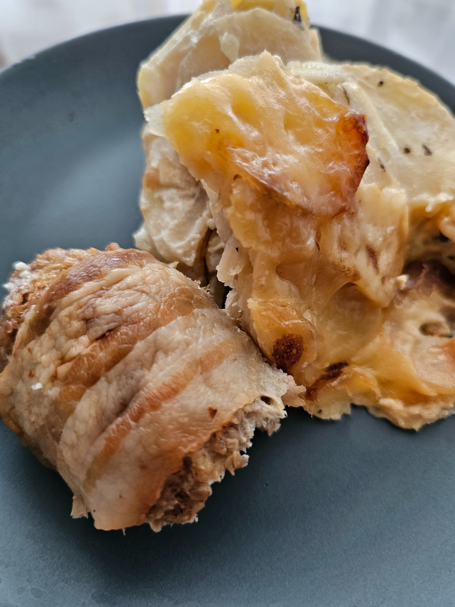 Котлеты в беконе Котлеты в беконе 500 гр фарша 2 луковиц 1 яйцо Небольшой кабачок на терке Упаковка бекона Соль, специи Фарш смешиваем с луком и кабачком, добавляем соль и специи, формируем котлетки, и оборачиваем беконом. Выкладываем в сковороду и запеканка в духовке минут 30, пока беконе не зарумянится. Подаём с картофелем или любым другим гарниром.