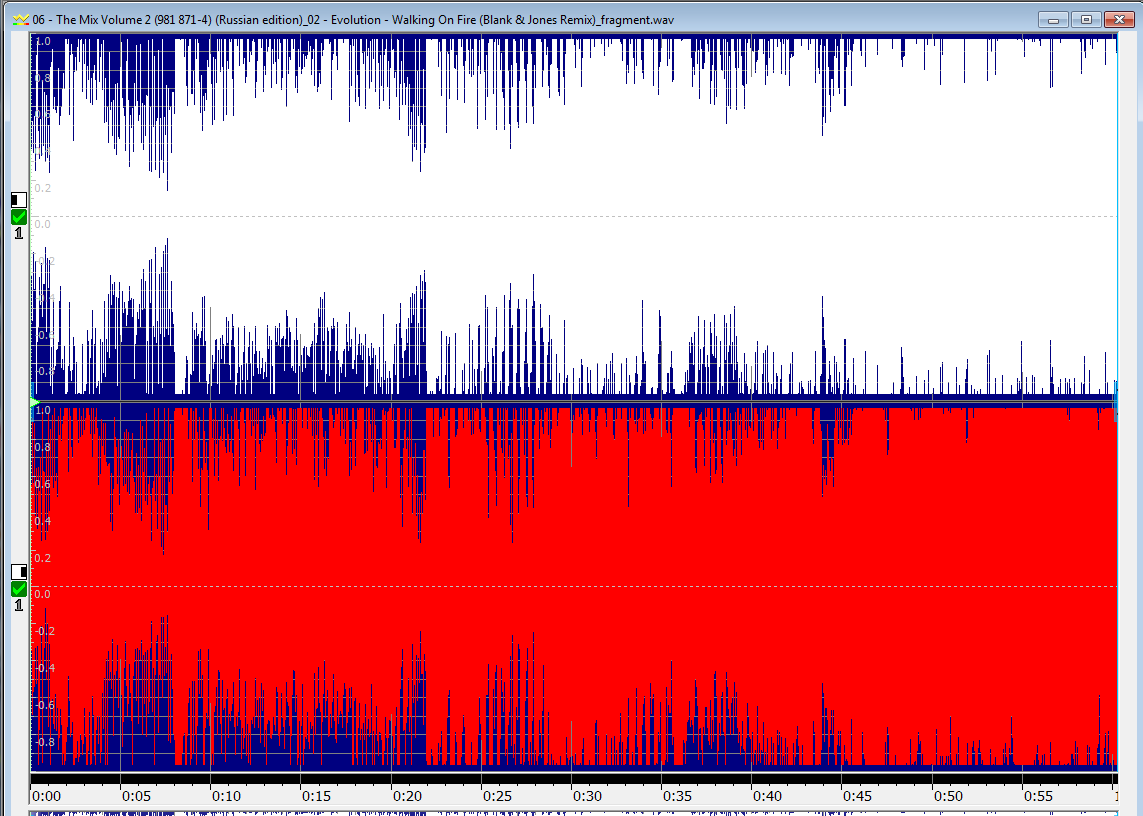 Обычная проверка в лоб на очень качественно записанном музыкальном материале , как правило, слабые места аудио тракта выявляет плоховато (зачастую вообще мимо!). Чтобы быстро проверить "на вшивость", выявив все подводные камни, без специальной подборки заковыристых (т.е. сложных для воспроизведения) треков не обойтись!!! Звучать такие треки могут не очень комфортно на слух - к этому следует быть готовым морально. Зато оперативно и точно в цель!!! Краткая аннотация по каждому треку уже имеется, но как показала практика, для массового потребителя этого недостаточно: требуется указать конкретные отрезки, пояснив что именно проверяется, к чему именно прислушаться и тп. 1) The Mix Volume 2 (981 871-4) (Russian edition)_02 - Evolution - Walking On Fire (Blank & Jones Remix) [fragment] Трек в студии загнан компрессором и лимитером, что называется, до упора (для убойной громкости-плотности): еще чуть привнесения дополнительной компрессии (в частности, лентой при записи с поджаркой уровня) - и