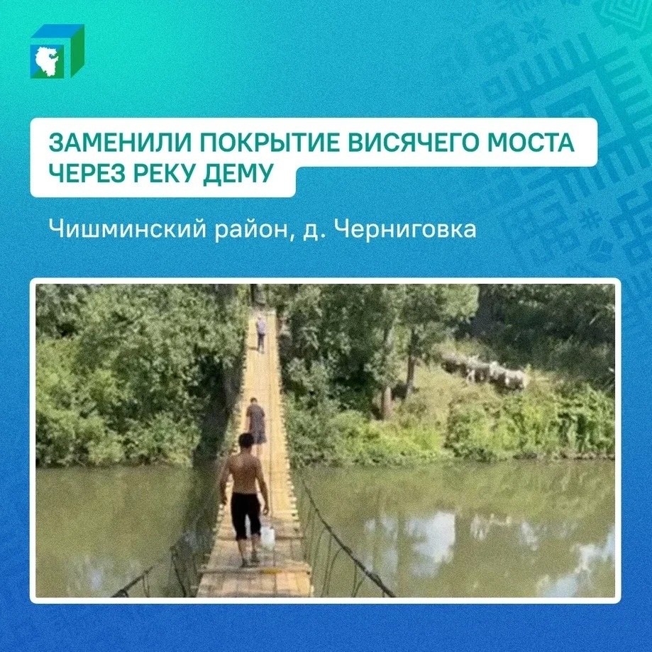 На висячем мосту через реку Дёму возле деревни Черниговки в Чишминском районе заменили покрытие, информирует Центр управления Республикой Башкортостан. Известно, что он находился в аварийном состоянии, о чем сообщили местные жители в соцсетях. Как выяснили в районной администрации по запросу ЦУР, мост был построен пару десятилетий назад силами самих сельчан и на балансе властей он не числился. Поэтому приняли решение создать инициативную группу в СНТ и изготовить необходимые материалы. Все работы завершили 22 августа. Ранее в селе Архангельское отремонтировали тротуар за 6,9 млн рублей в рамках программы поддержки местных инициатив.