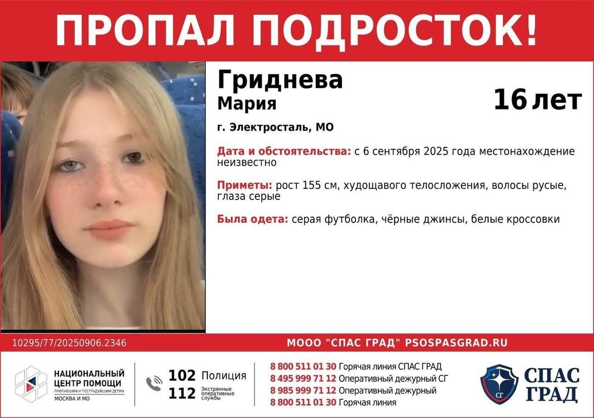 🔎 В соседней Электростали разыскивают 16-летнюю Марию Гридневу