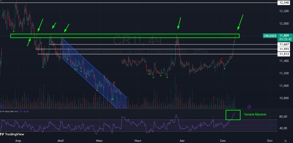 🔤 Юань-Рубль 🟢Фьючерсный график: Бьемся в уровень, который раньше не смогли пробить. Динамика такая же как в прошлый раз. Ожаидания у меня по валюте такие же как в прошлый раз - не считаю данный рост той самой резинкой, которую ждал, т.к. не было сигналов ни от Путина ни от Набиуллиной. что пора переключаться на спасение бюджета. Более того, Путин на ВЭФ заявил, что с бюджетом всё ок, он терпит. 🟢По RSI перекупленность как при прошлом спекулятивном росте. 🚗 Жду коррекцию по валютным парам с манипуляцией вниз. #юаньрубль #прогнозрубля #юань #рубльдоллар #CNY #CNYRUBF #CNYRUB #bogdanoffinvest