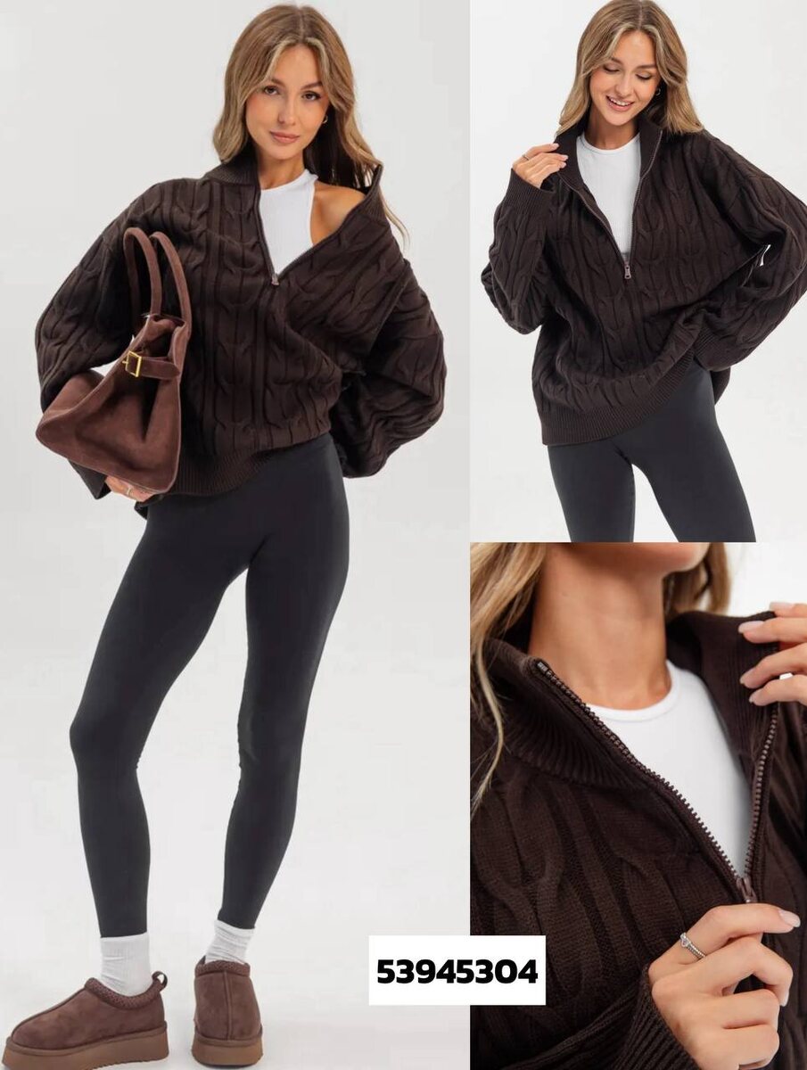 Объёмный трикотаж с рельефным узором и короткой молнией у ворота. Посадка свободная, плечо спущено, плотная резинка по низу собирает силуэт. Воротник можно носить закрытым, как полуводолазку, или распахнуть, показывая базовый топ — сразу появляется игра фактур.