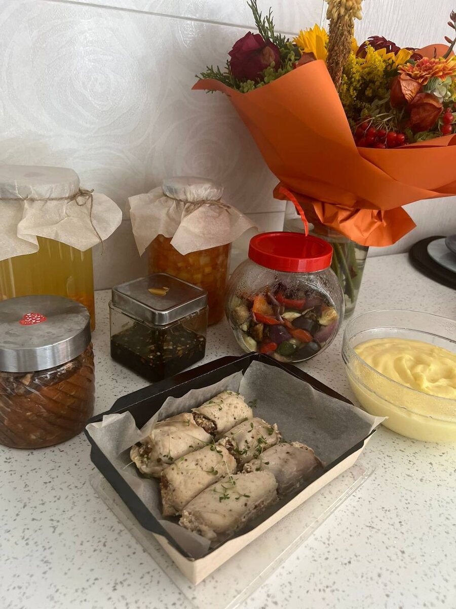 Щи из квашенной капусты со свининой Бульон из двух куриных бедра с зажаркой Говядина по бургундски Куриный рулет с вялеными томатами без бекона запеченный в фольге Пюре на молоке Салат овощи гриль: кабачок, баклажан, красный лук, шампиньоны, болгарский перец. Заправка отдельно #вашизаказы