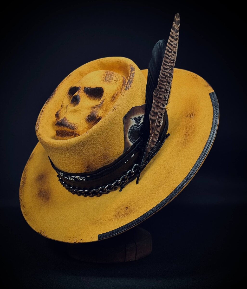 Недавний пост с желтой шляпой Gaucho вдохновил нас на новые эксперименты с этим ярким цветом. Результат — версия той же модели, но уже с черепом. Gaucho Skull: эффектный обжиг, кожаная лента с банданой, крупная металлическая цепь и связка длинных перьев. Заказать или просто спросить:) #gaucho #8см #жёлтый