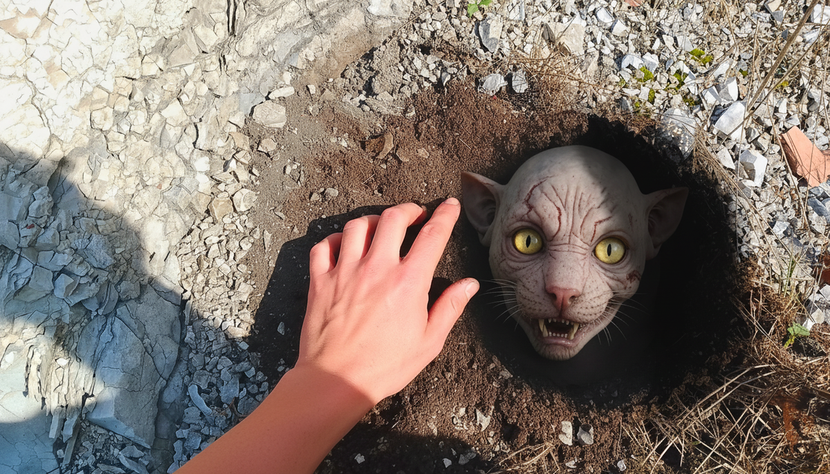 Игорь подошёл к этой норе, поскрябал около неё рукой и прислушался. Звук мяуканья доносился именно из этой вырытой норы. Все исследователи собрались рядом. Что-то происходило непонятное. В тот момент, не прошло и полминуты, как из норы показалась морда с жёлтыми глазами и лысым очертанием, лысым и морщинистым, как кошка-сфинкс, только намного крупнее и чуть страшнее.
