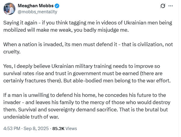 При этом в комментариях у Моббс разверзся сущий ад. Там пользователи с украинским флагом на аватарке предлагают не ограничиваться мужчинами, а поставить под ружье и женщин.