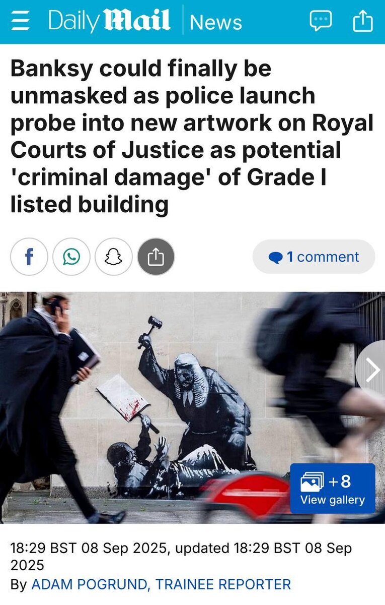 Бэнкси попал под раздачу в свободной демократической Британии: полиция Лондона начала расследование новой работы художника. Он нарисовал её на Королевском суде, а это здание является памятником архитектуры первой категории. За такое привлекают к уголовной ответственности. И тут самое интересное: если его вызовут в суд, то ему придётся публично раскрыть своё имя. Но это случится только в том случае, если ущерб оценят выше 5000 фунтов. Впрочем, редакция канала «Лобушкин» не может вспомнить более прекрасно и всемирно срежиссированного фейка, чем проект под названием «независимый уличный художник Бэнкси». Понаблюдаем. @lobushkin