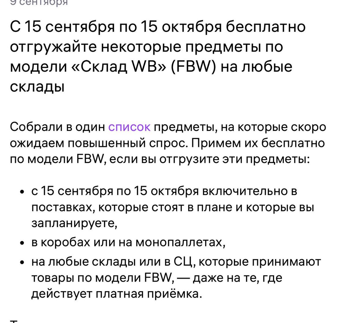Бесплатная отгрузка сезонных товаров! ВБ выпустил список товаров, по которым с 15 сентября по 15 октября можно отгрузиться бесплатно на любые склады (даже если будет действовать платная приемка). В списке : - шапки/шарфы/перчатки - канцелярия - некоторые спорт товары и товары для туризма - бытовая техника - стройматериалы - одежда для малышей и др ТОЛЬКО эти товары буду с бесплатной приемкой, если положить в одну коробку сумки и перчатки - перчатки примут бесплатно, а сумки - по тарифу.