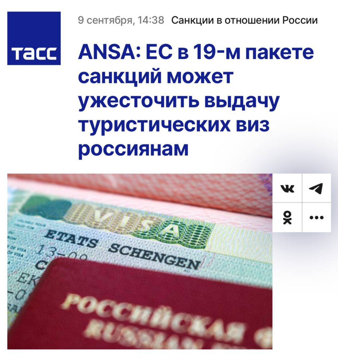⚡️ Россиянам могут перестать выдавать шенгенские визы — Еврокомиссия готовит новый 19 пакет санкций, в который планируют ПОЛНОСТЬЮ запретить выдачу туристических виз, сообщает ТАСС. Связано это со «слишком большим количеством российских туристов», которые этим летом ездили в Грецию, Италию и Францию. Власти этих стран уверены, что россияне не должны наслаждаться европейским образом жизни. Решение примут уже 12 сентября.