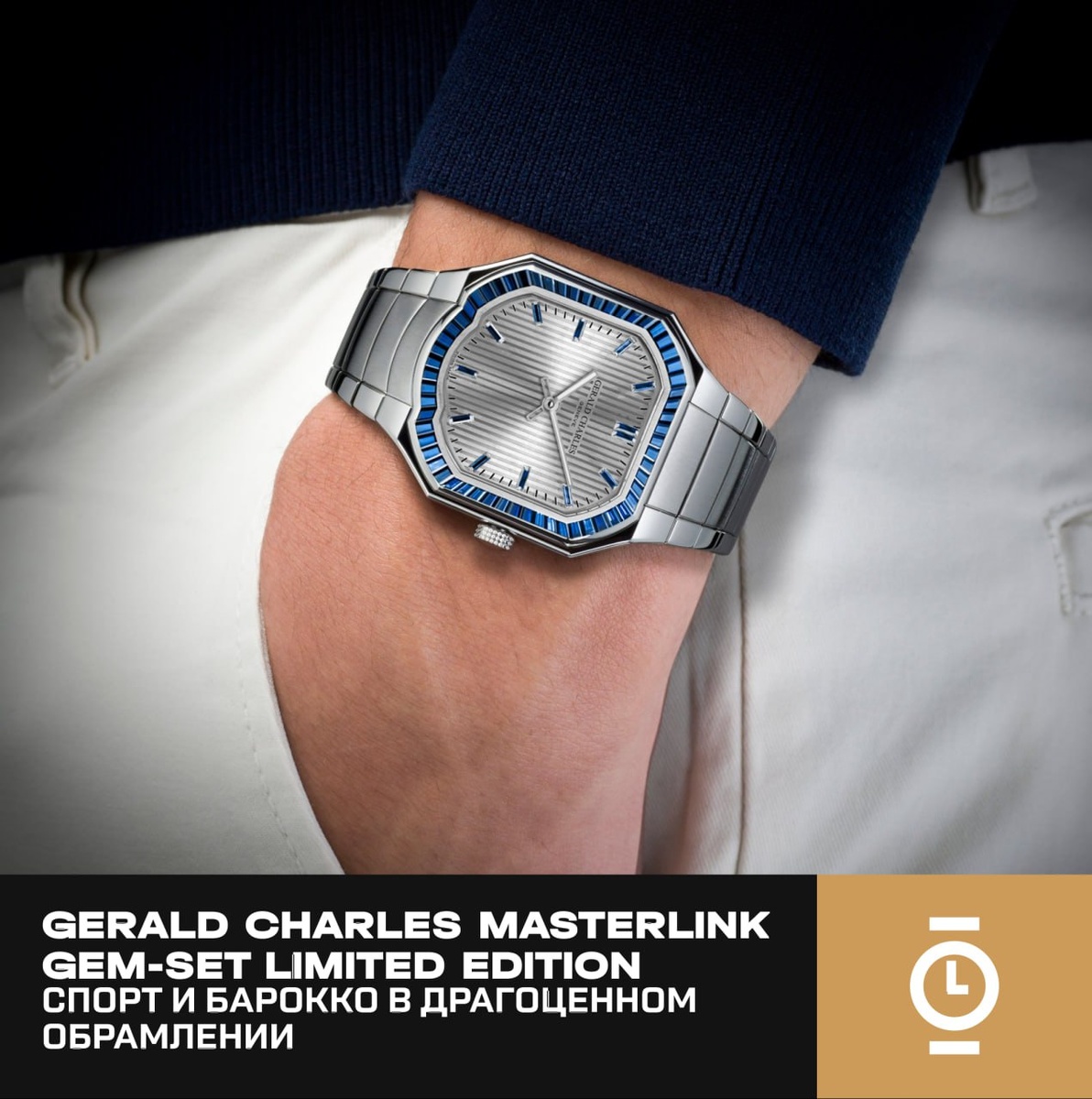 GERALD CHARLES MASTERLINK GEM-SET LIMITED EDITION: СПОРТ И БАРОККО В ДРАГОЦЕННОМ ОБРАМЛЕНИИ #новости_WD На Geneva Watch Days 2025 марка Gerald Charles представила лимитированные версии своей спортивной модели Masterlink, украшенные сапфирами, рубинами и цаворитами. Часы выполнены в стальном корпусе 38 × 38 мм и толщиной менее 8 мм, сохраняя барочные мотивы Джеральда Дженты — двухуровневый безель и фирменную «улыбку» на «6 часах». Верхний ярус безеля из белого золота усыпан 60 багетными камнями, каждый из которых вырезан индивидуально под асимметричные формы. Циферблат с серебристым линейным узором дополняют индексы из драгоценных камней и стрелки с Super-LumiNova. Асимметричный интегрированный браслет повторяет изгиб корпуса и отличается ювелирной отделкой, скрытыми винтами и застёжкой-бабочкой. Внутри установлен ультратонкий автоматический калибр с микроротором, созданный совместно с Vaucher Manufacture Fleurier, обладающий запасом хода 50 часов. Каждая версия выпущена серией в 10