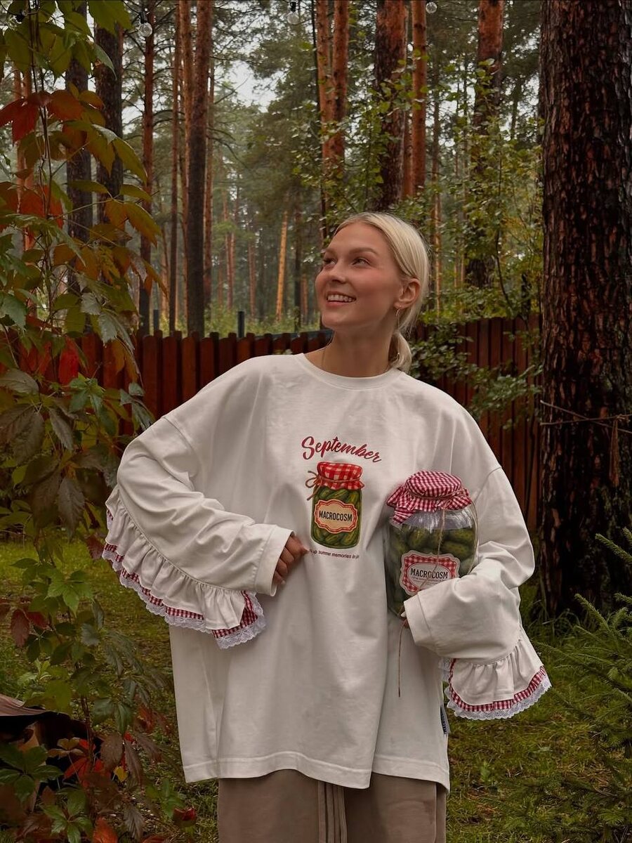 Прикол, бренд Macrocosm выкатил осенний лонгслив с банкой соленых огурчиков за 7900 рублей.