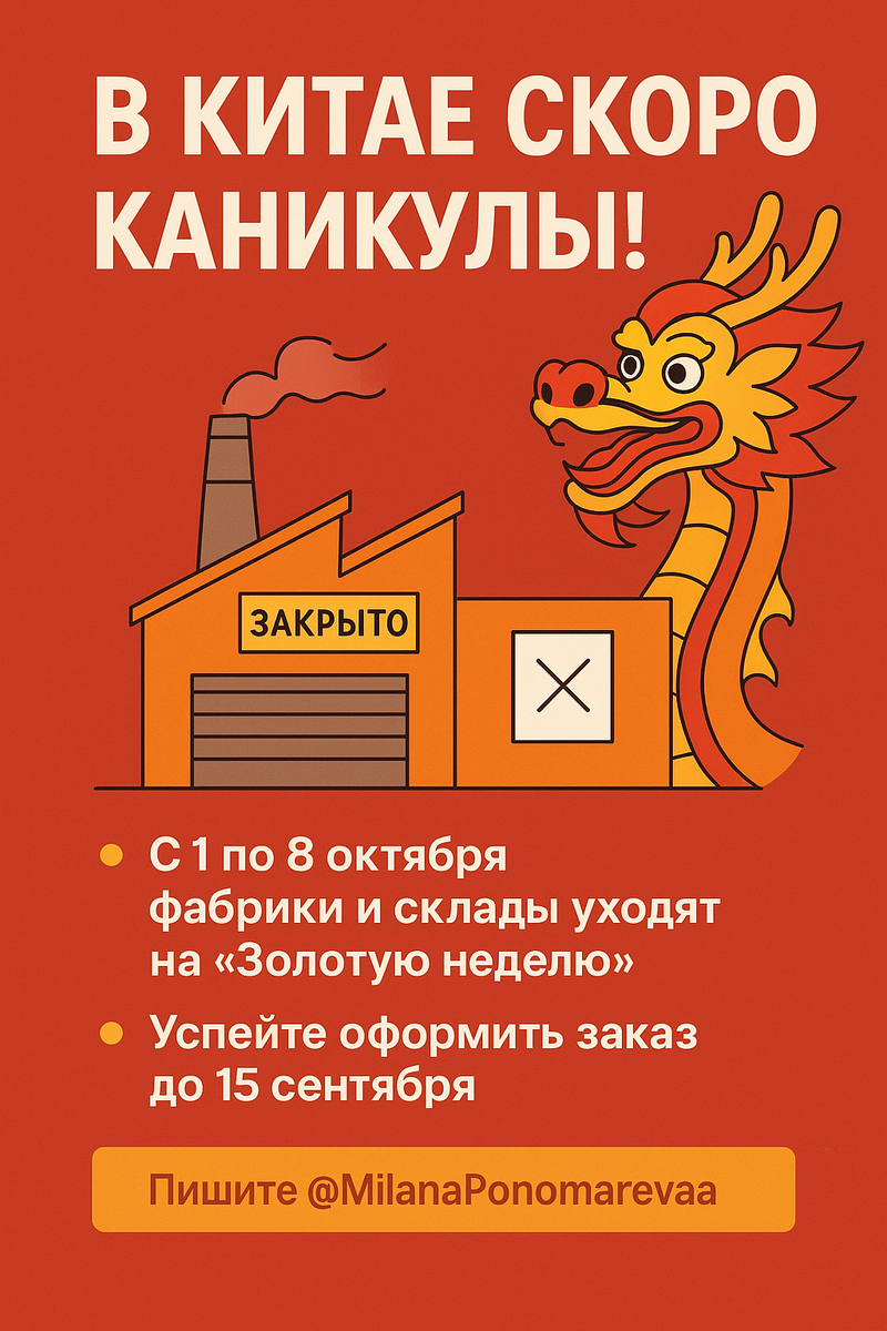 С 1 по 8 октября в Китае наступает особый период — «Золотая неделя» В этом году это время объединяет сразу два важных праздника Главный символ — полная луна, которая символизирует воссоединение людей, чтобы вспомнить родные края, проявить любовь к близким и выразить надежду на будущий урожай и счастье. Праздник выпадает в полнолуние 15-го дня восьмого лунного месяца китайского календаря. Из-за особенностей лунного календаря каждый год праздник выпадает на разные даты, по Григорианскому календарю чаще всего он приходится на вторую половину сентября или начало октября. 1 октября 1949 года на митинге на площади Тяньаньмэнь в Пекине было провозглашено образование КНР. 2 декабря того же года центральное народное правительство издало постановление об объявлении 1 октября национальным праздником. В эти дни Китай буквально останавливается: 👉 Если не учесть эти даты заранее, можно столкнуться с задержками ✅ Как подготовиться? Заранее предупреждаем клиентов о таких периодах и помогаем выстрои