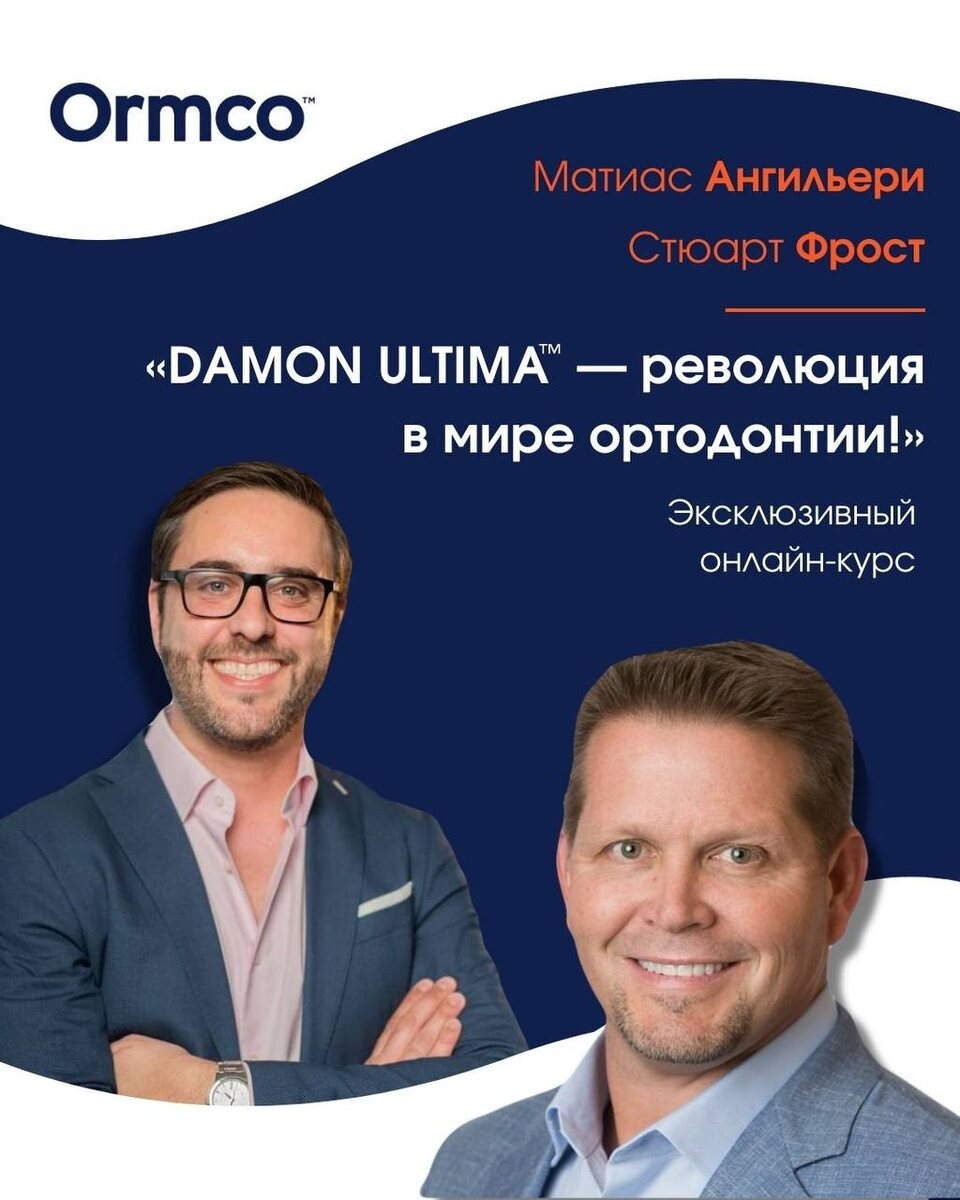 🔥 Погрузитесь в мир Damon Ultima™ вместе с мировыми экспертами! Начните новое профессиональное путешествие с докторами международного уровня — теми, кто стоит у истоков новейших ортодонтических подходов. 🧑⚕️👨⚕️Врачи-эксперты: Матиас Ангильери (Аргентина) Известный специалист в области ортодонтии и функциональной ортопедии, официальный амбассадор Damon System, спикер мировых ортоконгрессов. Стюарт Фрост (США) Врач-ортодонт, доктор стоматологии, член Американской Ассоциации Стоматологов. Один из ведущих практиков Damon Ultima™. 💡Что вас ждёт? Опытнейшие врачи поделятся своими авторскими подходами и практическими наработками: — 3 фазы лечения и биомеханика — Позиционирование брекетов — Выбор торка — Протокол смены дуг — Применение крючков, эластиков и другие лайфхаки Некоторые продукты могут быть недоступны в вашем регионе. Уточняйте наличие у менеджера Ormco. ✨Стоимость: бесплатно! Курс уже доступен, его можно пройти в любое удобное время. ⚠️ Курс проходит на платформе МТС Ли