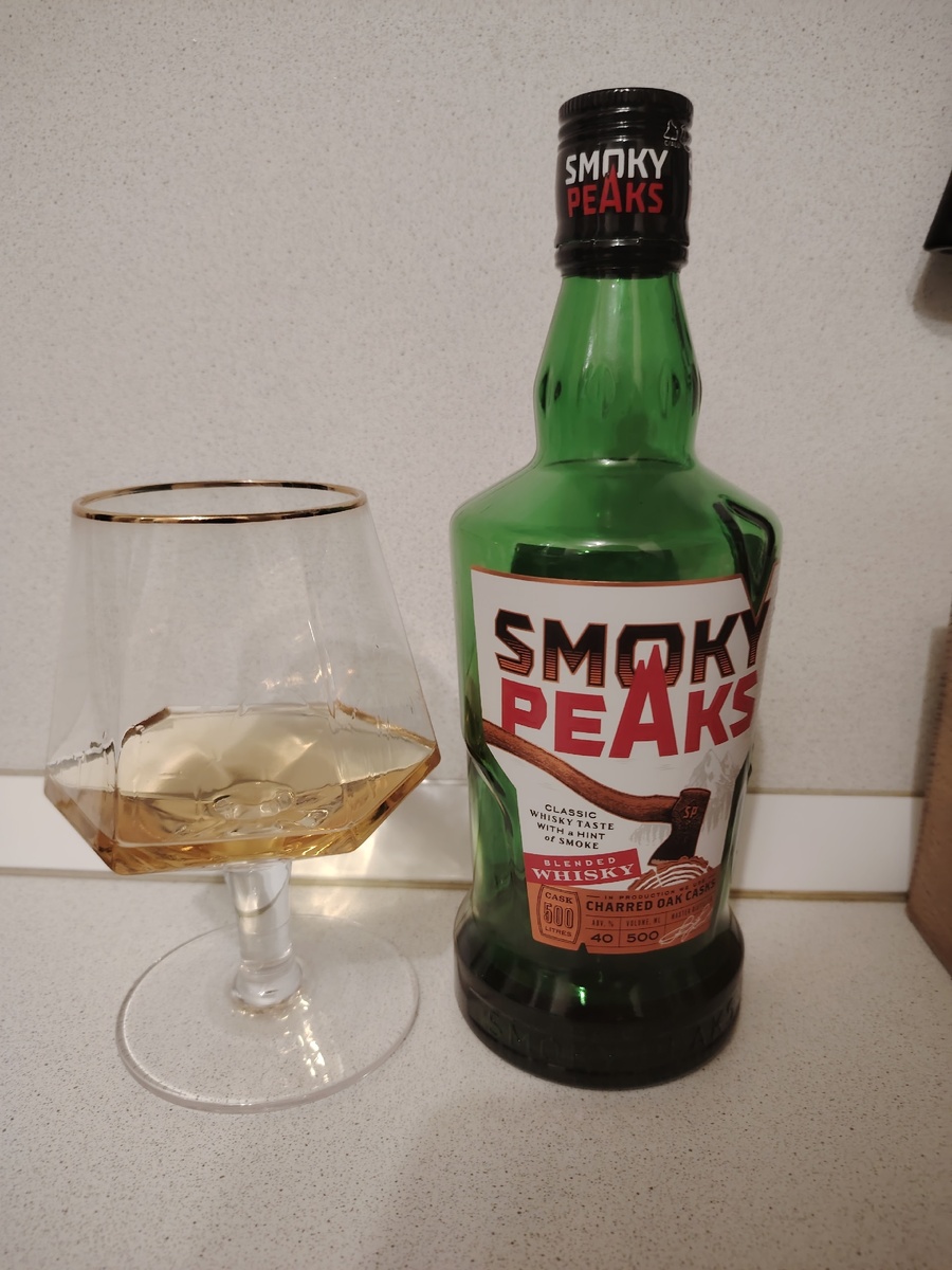 - Чрезмерное употребление алкоголя вредит вашему здоровью. Алкоголь противопоказан детям и подросткам до 18 лет, беременным и кормящим женщинам, лицам с заболеваниями центральной нервной системы, почек, печени и органов пищеварения. Ave, квириты! Обзор на виски «Smoky peaks». Казалось бы, это импорт, но… филиал АО «Татспиртпром» «Vigrosso», Республика Татарстан. Производитель именитый и достойный, но что у него с виски? Прикладываю страничку с сайта (https://tatspirtprom.ru/catalog/smoky-peaks/). В линейке только этот экземпляр. Написано следующее. SMOKY PEAKS - купажированный виски, имеющий характерный шотландский профиль. Бочки и дубовая щепа, в которых выдерживается виски, изготовлены из скального кавказского дуба, что дает неповторимый и мягкий вкус классического виски с дымными нотами, раскрывая поистине шотландский характер. В аромате виски чувствуются тона обожженного дуба и сладких фруктов. Состав: российский зерновой висковый дистиллят, российский солодовый висковый дистиллят,