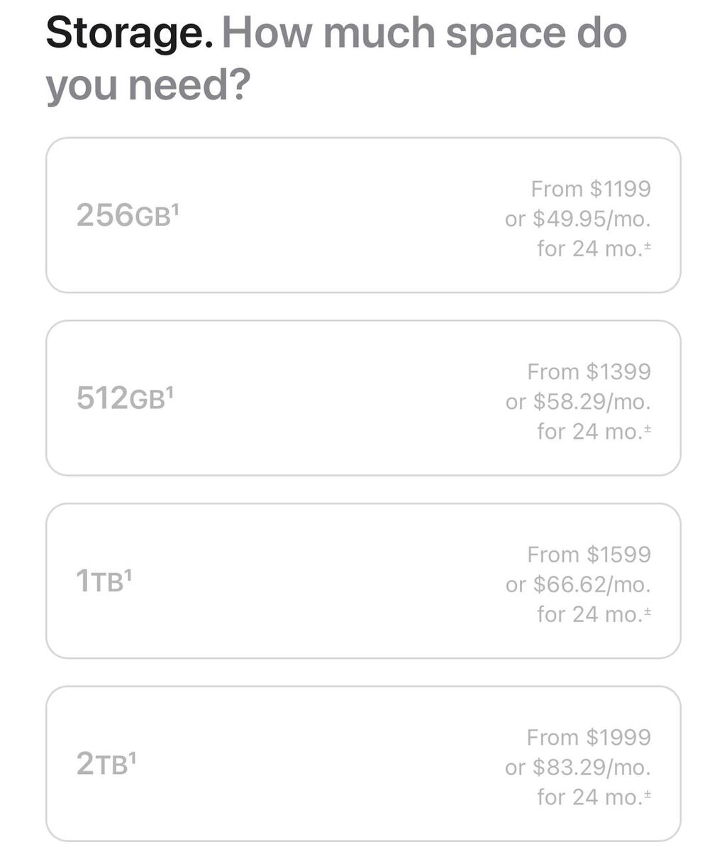 iPhone 17 Pro Max на 2 ТБ — $2000. На сцене не озвучили, но на сайте всплыло Самая жирная конфигурация тихо ушла за психологическую планку. Похоже, решили не ломать вайб презентации озвучкой «двух тысяч» вслух. Мой взгляд: память по цене второго телефона — спорный апгрейд. Тем более когда облака и внешние носители под рукой. А вы упирались когда‑нибудь в 1 ТБ на телефоне? Или 512 ГБ + облако хватает с головой? #Techtaim