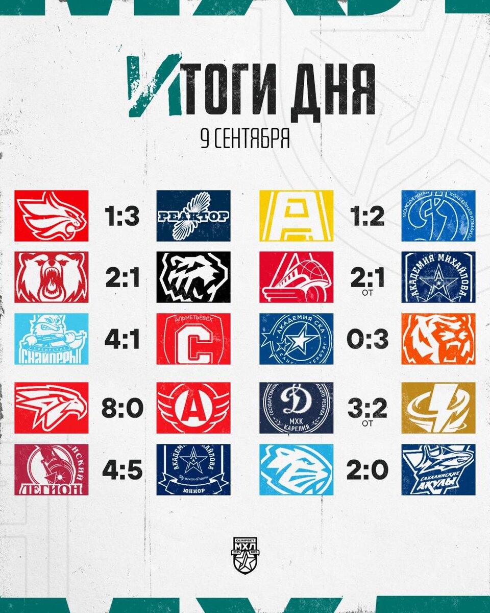 Итоги дня в МХЛ «Омские Ястребы» показали отличную результативность, наколотив 26 шайб всего за четыре игры. «Динамо-Шинник» и «Амурские Тигры» начали сезон с сухих побед, не пропустив ни одной шайбы в своих первых матчах, а «Локо» только в овертайме смог вырвать победу у «Академии Михайлова». 📸МХЛ @nhockey
