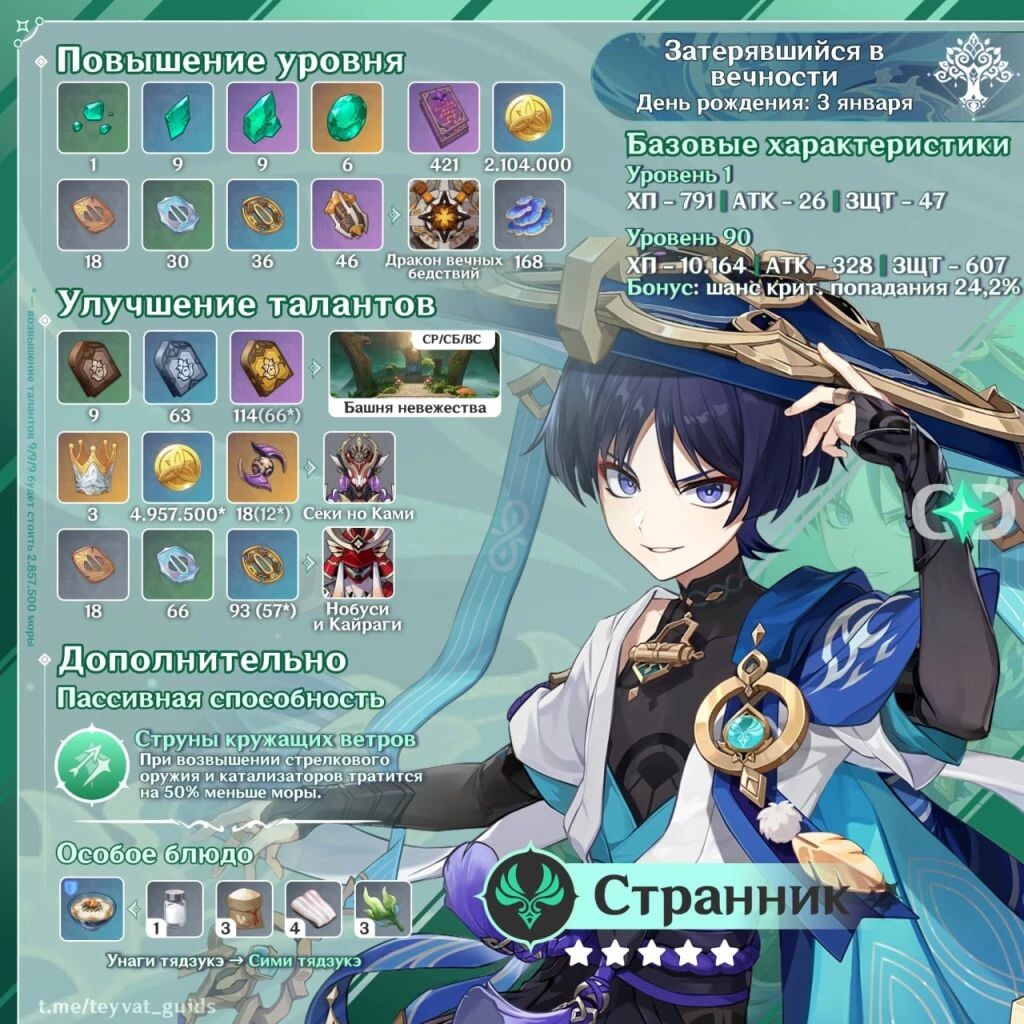 ㅤ߷ Весь урон Странник наносит обычными и заряженными атаками в стойке, поэтому в первую очередь стоит прокачивать именно обычные атаки — элементальный навык даст им лишь усиление.