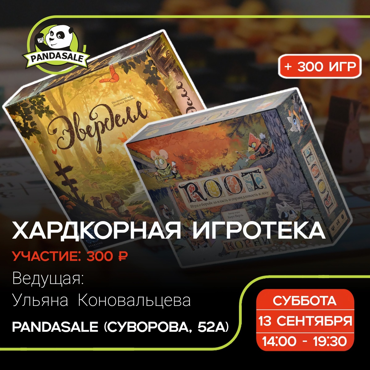 💫 Приглашаем на хардкорную игротеку 13 сентября. Сделайте свою субботу незабываемой! 📍 Где: Суворова 52а ⏰️ Во сколько: с 14:00 до 19:30 🗣 Ведущая: Ульяна Коновальцева ➕ Участие: 300 рублей 🎲 Игры, в которые научим играть: 🌳 14:00 — Root / Корни Root / Корни — это асимметричная стратегия для 2–4 игроков. Возглавьте одну из четырех совершенно разных фракций и бросьте вызов соперникам в борьбе за господство над Лесом! Каждая фракция побеждает своим особым способом: одни захватывают территории в открытом бою, другие организуют восстания и действуют из тени, а третьи добиваются успеха, выполняя задания и мастерски балансируя между враждующими сторонами. • Всего 4 места. Запись в комментариях. ☀️ 15:00 — Эверделл В Эверделл вы возглавите лесное королевство. За игровой год нужно успеть собрать ресурсы, освоить земли, возвести сооружения и привлечь побольше животных. Близится зима, и только от вас зависит, кому бороться за выживание, а кому веселиться на празднике урожая. • Всего 4 м