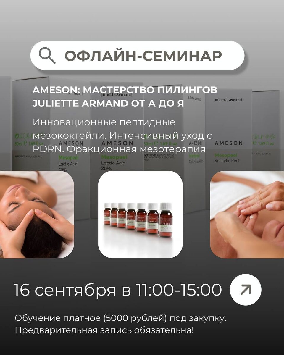 Уже в следующий вторник, 16 сентября, встречаемся с вами на офлайн-семинаре: «AMESON: МАСТЕРСТВО ПИЛИНГОВ JULIETTE ARMAND ОТ А ДО Я» Стоимость обучения — 5000 ₽ под закупку. После семинара вы сможете приобрести сертифицированную профессиональную продукцию на эту сумму. А ценные знания и опыт вы получаете абсолютно бесплатно! 📍 Москва, Архангельский переулок, д. 7, строение 1 Места ограничены, запись обязательна. Записаться можно через WhatsApp — ссылка тут👈🏻