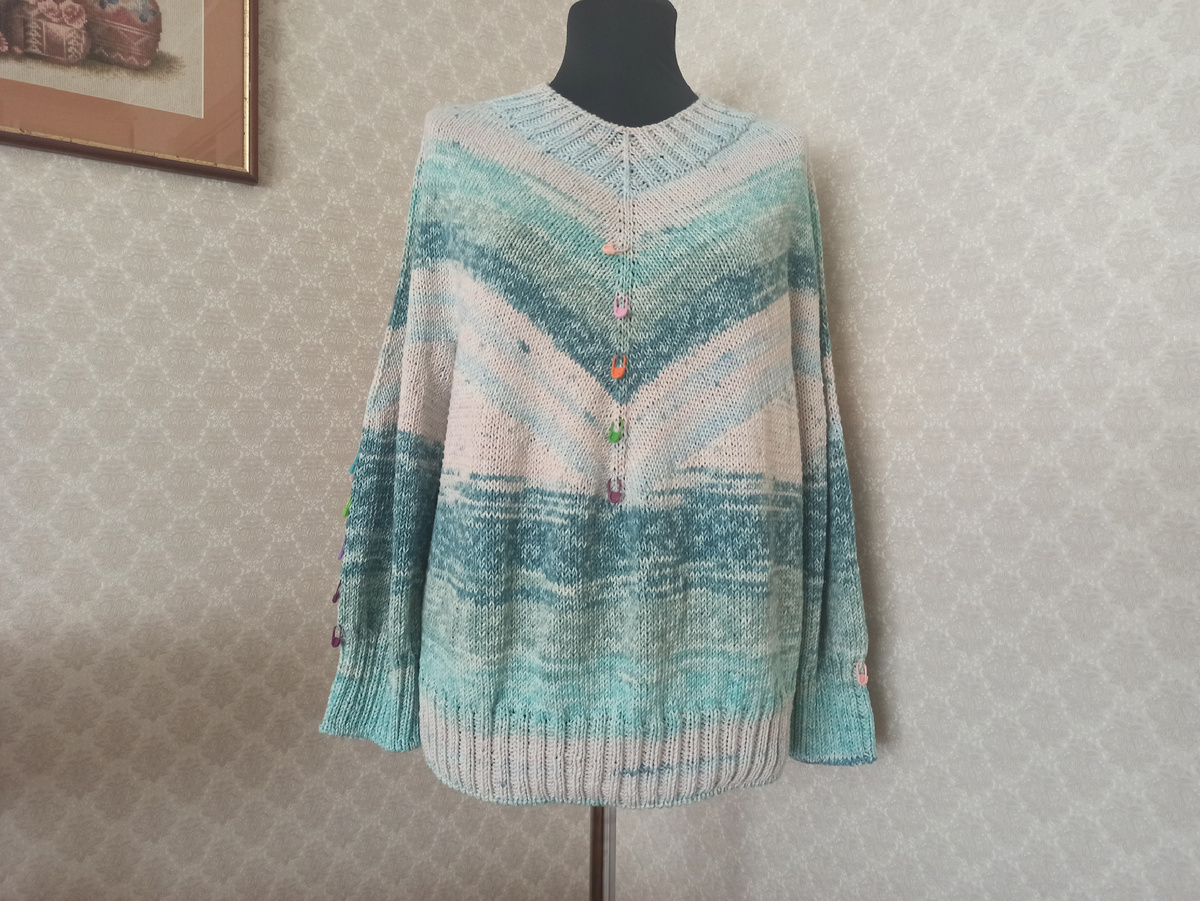 - Модель вяжется сверху вниз, даёт прекрасную посадку за счёт легкости полотна и особенностей пряжи.