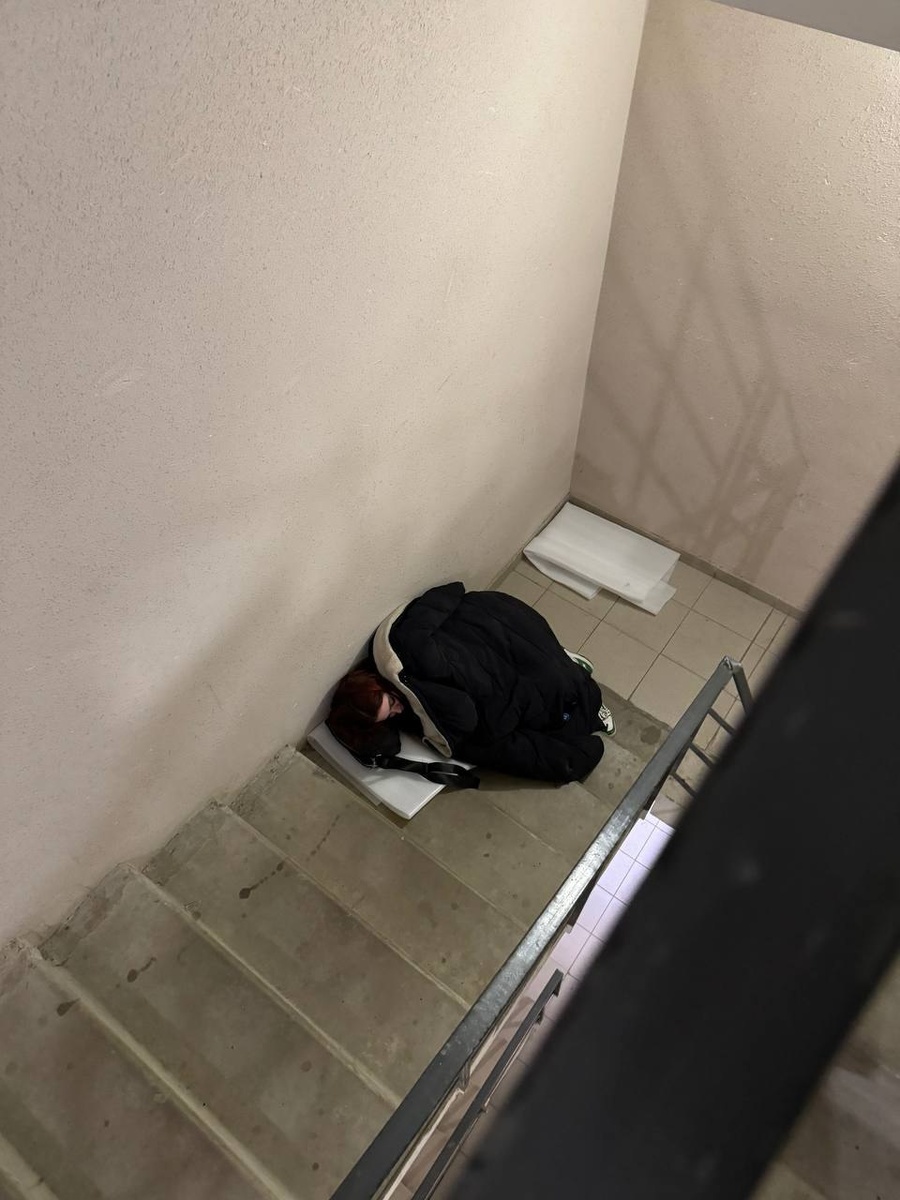 Девушка лежит на пожарной лестнице. Если тут есть родители, напишите мне