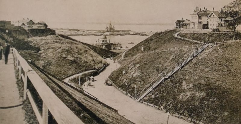Не узнать Похвалинский съезд в Нижнем Новгороде на фото даже 120-летней давности невозможно. Панорама изменилась мало. Ну да, теперь вверх-вниз снуют не телеги, а машины, дорога стала пошире за счет подошв холмов. Но изгибы всё те же. Но главное – тот же вид на Стрелку, на слияние Оки и Волги с почти совмещенными на одной линии Алексеевской церковью Благовещенского монастыря и собором Александра Невского на том берегу Оки. Да, теперь еще виден Канавинский мост (открыт в 1933 году), стадион на том берегу. Да скоро построят ледовую арену. Исчезла частная застройка по бровкам холмов. Сами склоны не застраивались из-за крутизны. Да, кстати, по-нижегородски это вовсе не холмы, а настоящие горы. Это какие-то там Рим да Москва стоят на семи холмах каждый. А Нижний Новгород стоит на семи горах. Это вам не хухры-мухры. Так вот Похвалинский съезд проложен по дну Гремячего оврага, пролегавшего между горами Гремячей (справа) и Гребешок (слева). Между прочим, вид с бровки Гребешка еще лучше: Похвал