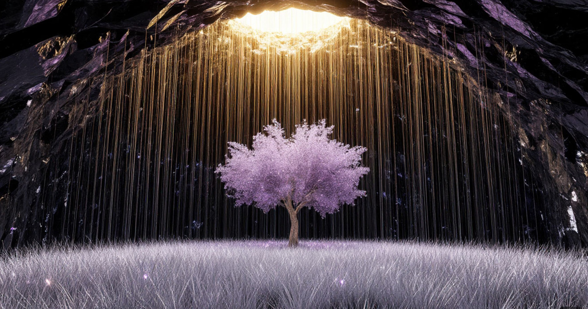 Под ногами простиралось… поле. Поле из серебристой травы, те самые стебли, что росли на поверхности, но здесь, под землёй, они были выше и на их концах покачивались светло-фиолетовые, излучающие мягкий свет соцветия. В центре зала стояло дерево — или нечто, его напоминающее. Его «кора» была сложена из наслоений того же минерала, что и стены, а вместо листьев с ветвей свисали длинные, тонкие нити, мерцающие и переливающиеся, как оптоволокно.