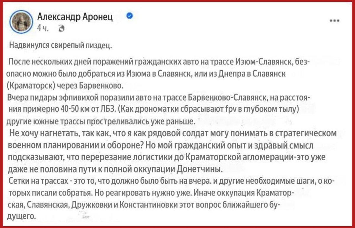 ВС РФ берут под огневой контроль трассу «Барвенково-Славянск» и бьют транспорты ВСУ на расстоянии 50 км от линии фронта, — об этом сообщил боевик навоза и бывший депутат Киевского горсовета Александр Аронец. Он заявил, что российские войска начали наносить дальние удары за счëт сброса FPV-дронов с БПЛА-маток. Также он сказал, что в случае бездействия ВСУ освобождение российской армией оставшейся части ДНР станет «вопросом ближайшего будущего». Подпишись на Телеграм Александр Семченко