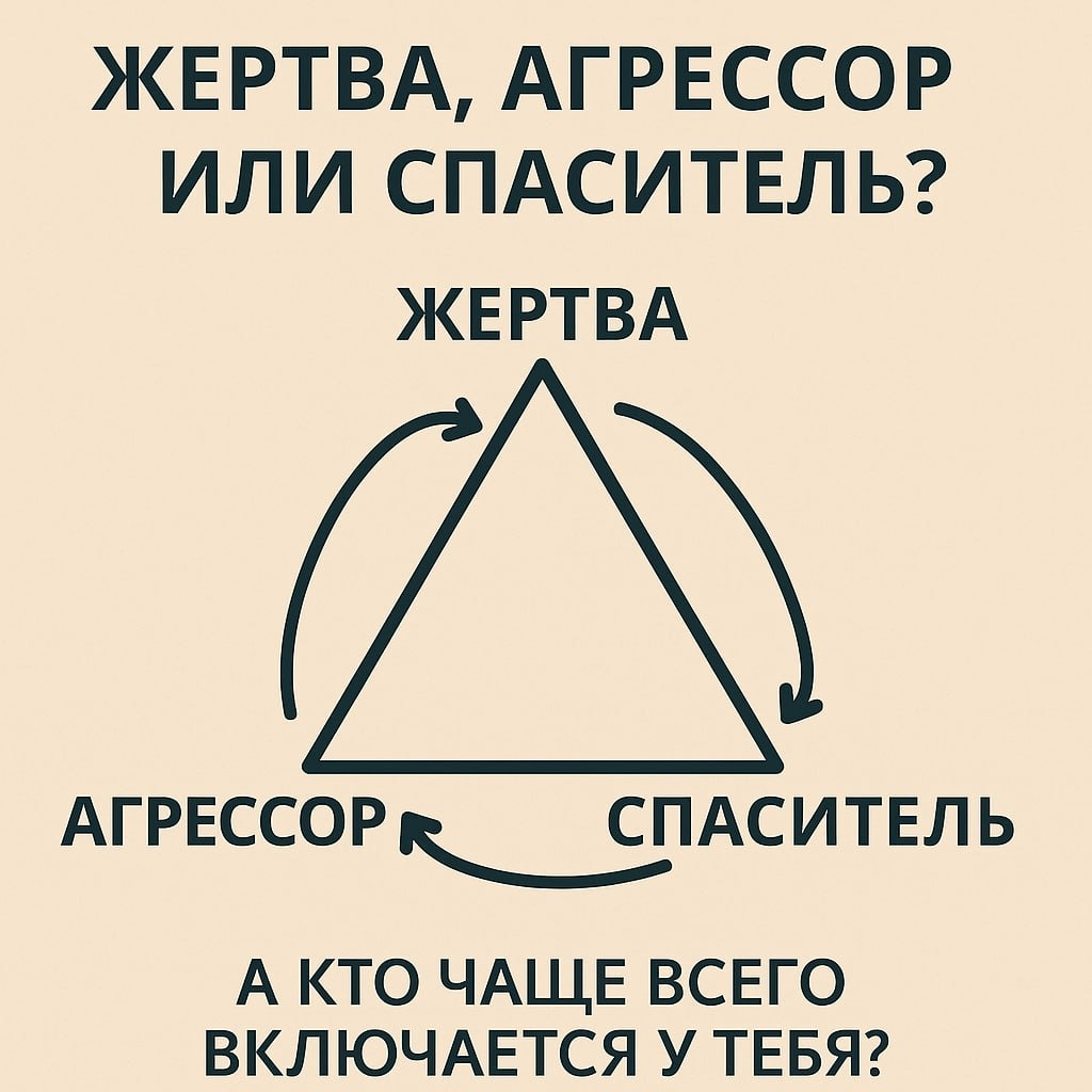 🔥 ЗАСТРЯЛ В ТРЕУГОЛЬНИКЕ БЕЗНАДЁЖНОСТИ? Знакомые роли? ▪️ Жертва: «Со мной всегда так... Мне больно и страшно». ▪️ Агрессор: «Это ты во всём виноват!» ▪️ Спаситель: «Да я всё сам, без меня вы не справитесь!» Мы меняем эти маски по кругу, тратя силы на игры, а не на жизнь. Но выход есть — осознать свою роль и сменить её. ❓ Какая роль твоя любимая? Отмечай ниже 👇 ➡️ Жертва ➡️ Агрессор ➡️ Спаситель 💥 Уже СКОРО — второй эфир «Активации Жизни»! Тема: «Хватит играть роли. Стань Режиссёром.» Мы разберём: ✅ Как выйти из вечного круга ролей и перестать быть марионеткой. ✅ Кто такой Режиссёр своей жизни и как им стать. ✅ Практики мгновенного выхода из Жертвы, Агрессора и Спасителя. ⏰ 2-й день эфира: 11 сентября в 19:00 (мск) 🎫 ФОРМАТЫ УЧАСТИЯ: │ ├ 📍 Базовый (0₽) │ ▪️ Доступ к эфиру в режиме «наблюдатель» │ ▪️ Чат с единомышленниками │ ▪️ Возможность задавать вопросы в чат │ ├ 📍 Активный (🐣 Ранний билет — 2 900₽) │ ▪️ Полная запись эфира (навсегда) │ ▪️ Домашнее задание для проработ