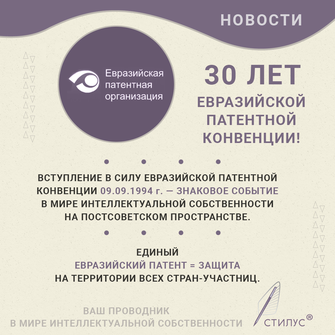 Вступление в силу Евразийской патентной конвенции 09.09.1994г. - знаковое событие в мире интеллектуальной собственности на постсоветском пространстве. Единый евразийский патент = защита на территории всех стран-участниц. Евразийская система патентования постоянно развивается. С 01.06.2021г. Евразийское патентное ведомство начало принимать заявки на выдачу единого евразийского патента на промышленные образцы (дизайн изделия). В настоящее время система позволяет получить единый патент на изобретение или промышленный образец (дизайн изделия) в 8-ми странах: Российская Федерация, Республика Беларусь, Республика Казахстан, Азербайджанская республика, Кыргызская республика, Республика Армения, Республика Таджикистан, Туркменистан.