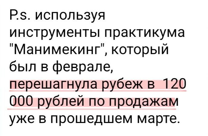 "Быстрые" деньги - это что-то на инфоцыганском? Только для тех, кто не разбирается в фундаментальных принципах продаж. На скриншоте 🔼 пример реализации заповедей "Манимейкинга": помимо "быстрых" денег получилось за месяц сделать скачок до 120 000 руб. Эксперт - консультант по детскому сну, питанию и пищевому поведению. Ну знаете, та ниша, в которой часто жалуются, что никто не покупает)) ——— Почему мы начинаем осень именно с Манимейкинга? 👉🏻 Потому что это про возможность управлять своим доходом. Понимать, на какую педаль газа мне надо нажать именно сейчас. Когда у меня есть время "играть" вдолгую, а когда - нет. "Долгие" деньги - это прекрасно. Это капитал, лояльность, уважение и доверие аудитории. Это про имидж, репутацию, отношения с клиентами. Но не всегда есть возможность "впрягаться" сразу вдолгую. И тогда есть этап “быстрых" денег. Когда вам надо продать старую детскую коляску, вы же не будете создавать Телеграм канал и делать прогрев, верно? 😉 На Манимейкинге я
