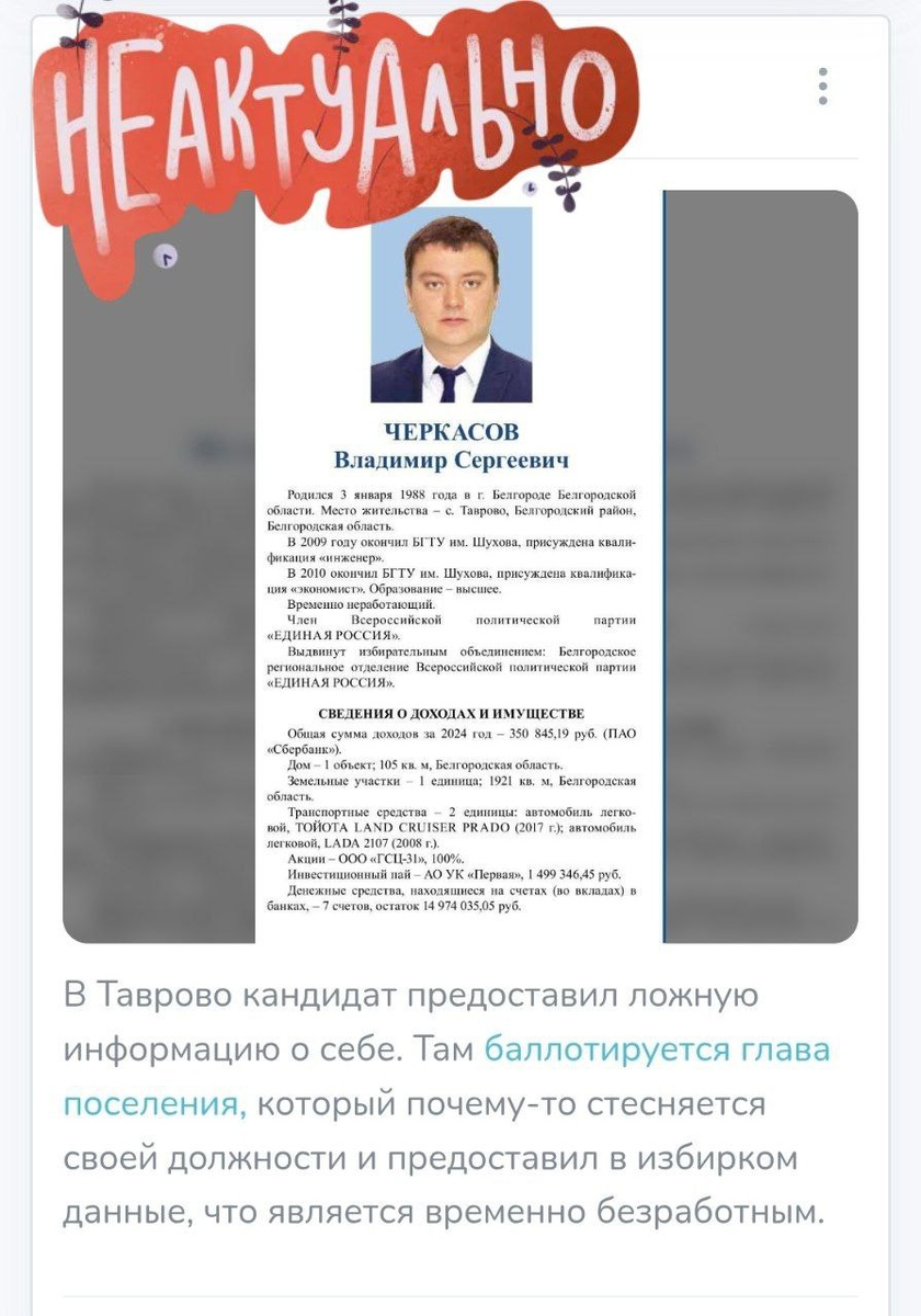 🗳 Анонимные телеграм-каналы снова пытаются играть в разоблачителей. На этот раз один из них обвинил кандидата в депутаты Владимира Черкасова в том, что он якобы скрыл сведения о работе и подал в избирком «липовые» данные. 🔎 «Фонарь» проверил факты. Оказалось, Черкасов с 2018 года возглавляет Земское собрание Тавровского сельского поселения — выборная, но неоплачиваемая должность, которую можно совмещать с другой работой. Кроме того, он учредитель компании «ГазСтройЦентр-31», которая последние годы фактически бездействует: ни сотрудников, ни доходов. 📌 Сам кандидат говорит прямо: «Я нигде не работаю по найму, и данные, которые предоставлены, абсолютно достоверны. Зачем скрывать? Всё прозрачно и открыто». Так что история про «недостоверные сведения» оказалась больше похоже на попытку разогреть скучную избирательную кампанию, чем на реальное расследование. Впрочем незарегистрированный в Роскомнадзоре канал уже давно периодически вводит своих подписчиков в заблуждение. 🔦Подпишись на