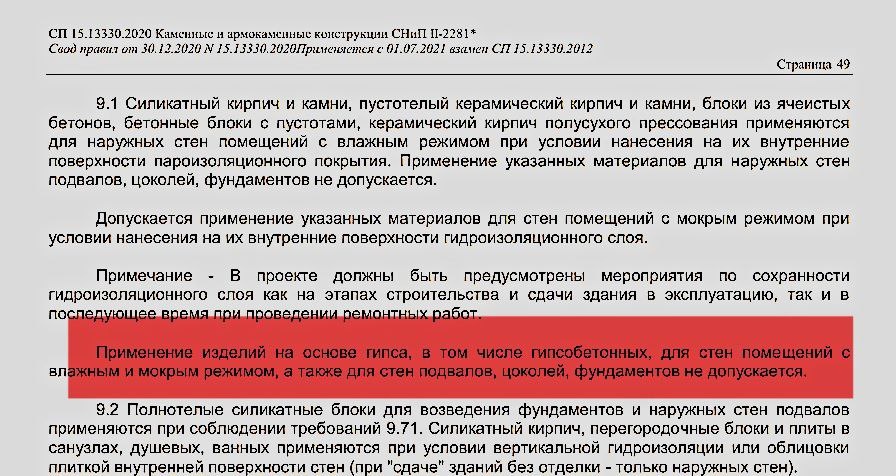 Изделия на основе Гипса, а так же Гипсобетона, для стен помещений с Влажным и Мокрым режимом НЕ ДОПУСКАЮТСЯ!