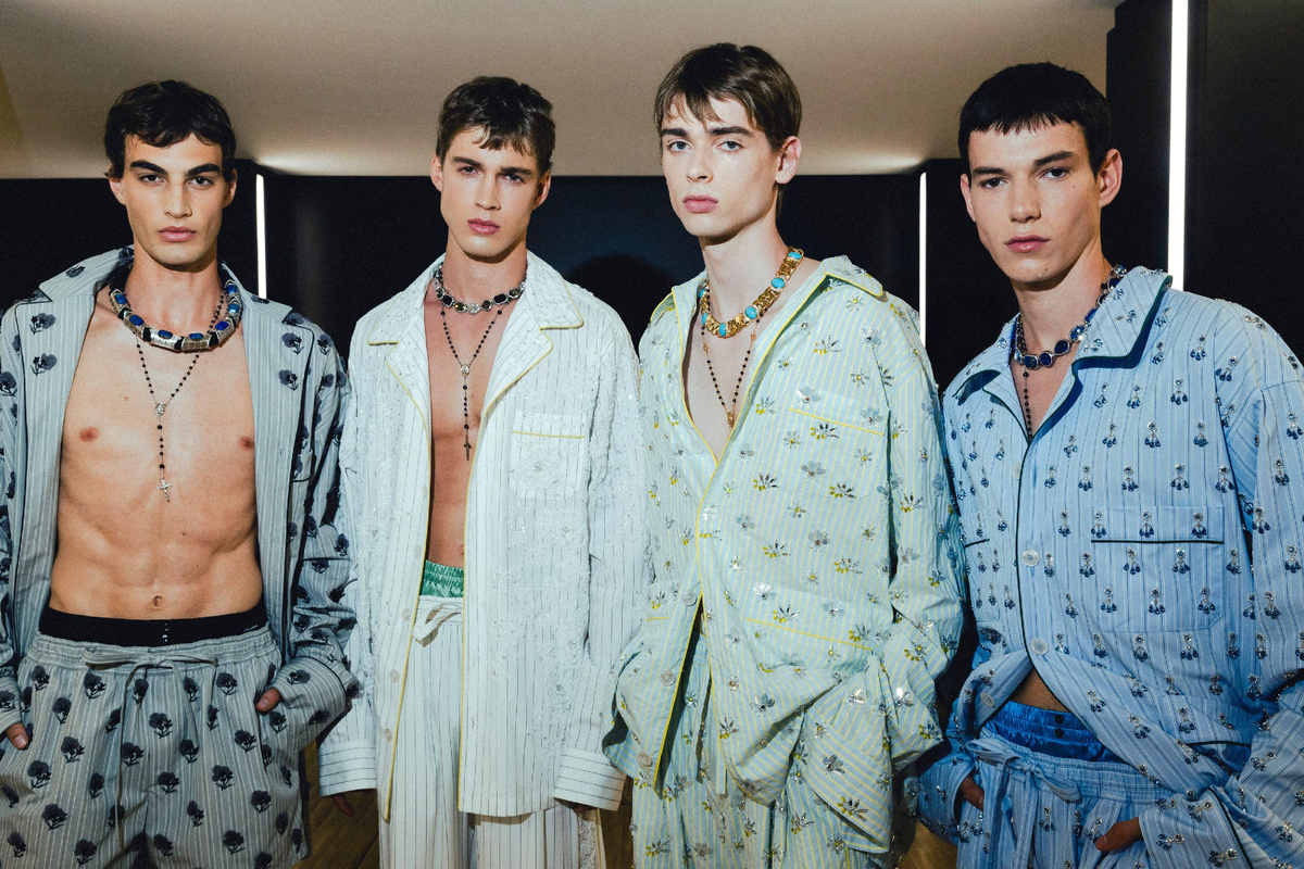 Финал — модели в блестящих, расшитых пижамах вышли прямо на улицу, показывая, как luxury встречается с повседневностью.