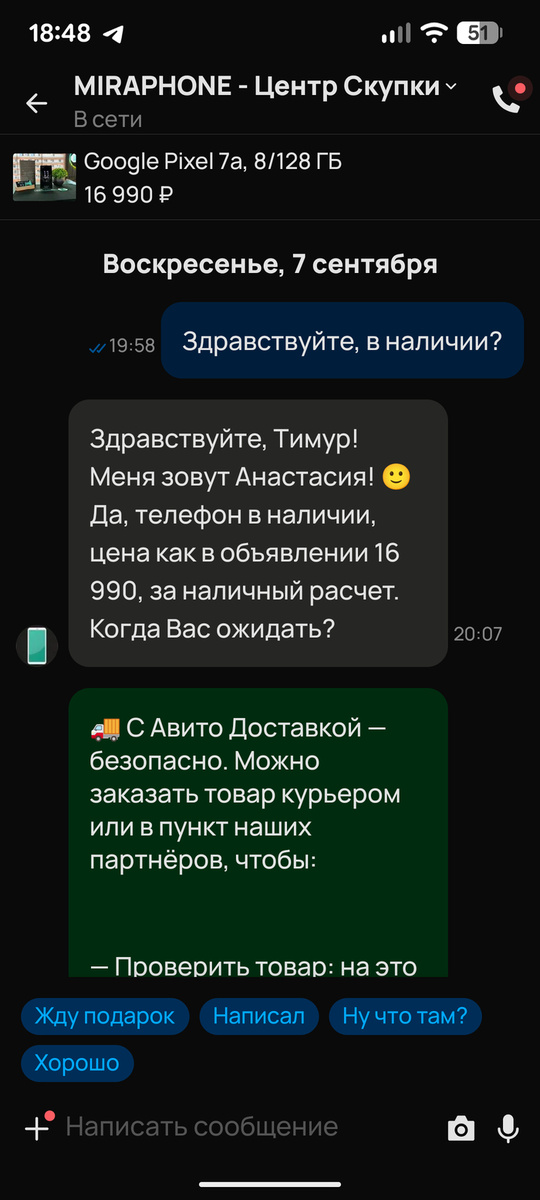 Приветствую. Не много времени прошло, что бы авито снова показало, что как сервис они Г-но. И ситуация снова связана с Магазинами. С тем, зачем мы заходим на авито. Верно? Мы ведь заходим на авито что бы посмотреть какие товары продают с магазинов? Так, или нет, Авито это не волнует. И вы будете видеть в ленте объявления от магазинов, даже если включите фильтр. Вот и я столкнулся с одним из таких магазинов, которые в итоге просто потратили мое время (но тут ещё вопрос, кто больше молодцы, магазин, или авито?). Дело было так, нахожу объявление в Авито от магазина, решил написать актуально ли оно, т.к. цена меня устраивала. В ответ получаю: То есть и телефон в наличии, и цена как в объявлении. Ок. Приезжаю в магазин, там начинается клоунада, мол нет такого телефона, но есть такой же, в лучшем состоянии на 30% дороже. Я замешательстве, ну, думаю, тут точно отзыв. А они для них важны, т.к. продавец обещал скидку за хороший отзыв в Авито) Для начала пишу консультанту, или кто у них сидит с