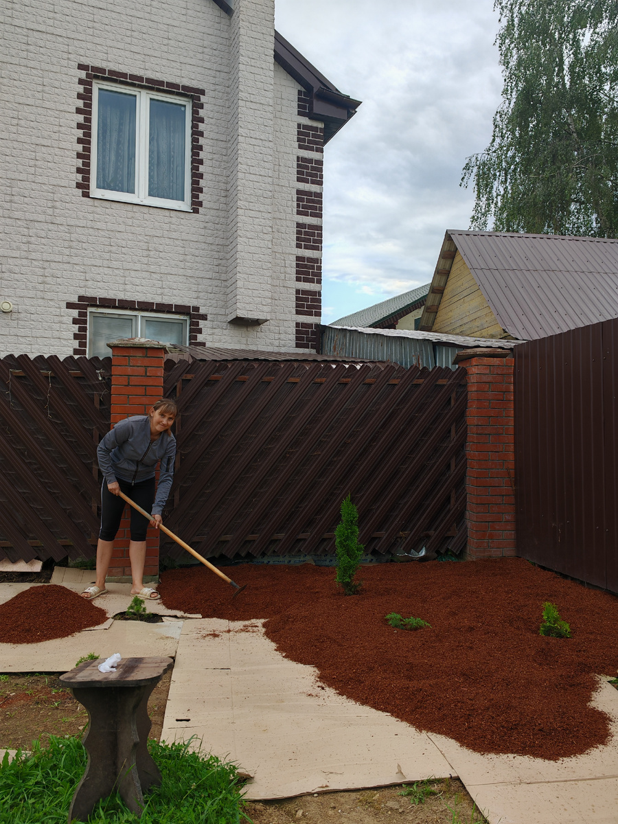 И так, хотела поделиться своим мнением по поводу моей клумбы и мульчировании гумосом из лиственницы. Первым делом мы снимали верхний слой грунта вместе с сорняком, укладывсли картон, а сверху уже гумус. Гумус он как опилки от лиственницы имеет очень приятный запах и цвет. К тому же медленней разлагается и не закисляет почву если сравнивать с сосной. Мешок такого гумуса стоит 250 рублей в Подмосковье. В идеале сверху гумуса ещё постелить кору крупной фракции как слева на фото, но это будет постепенно т. к. она совсем не дешёвая, можно конечно и без неё, тогда слой гумуса делать толще. Но гумус преет быстрее коры и подсыпать его нужно будет чаще. Я сейчас смотрю за ценами на кору, вроде бы к концу сезона будет снижение. Ах да, растёт ли трава сейчас? Да растёт, прорастает! К счастью в единичном количестве. В основном это одуванчик "злодей" 😠 И с слабой корневой. Его легко выдернуть. Поэтому я лучше бы застелила корой. Чтобы у сорняка совсем было мало шансов. Мне советовали стелить п