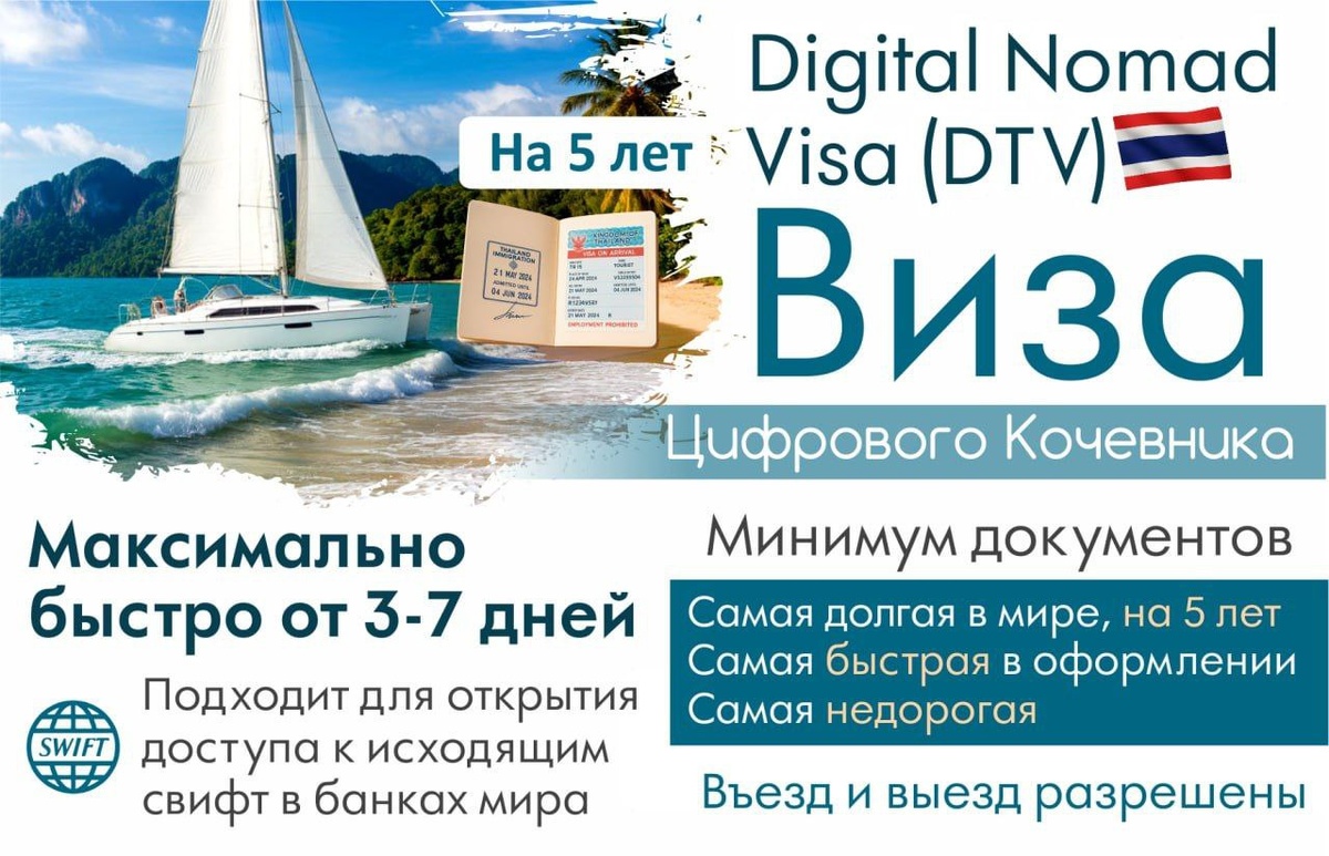 ➖ Что такое DTV? Destination Thailand Visa (DTV) — это официальная виза для цифровых кочевников, запущенная правительством Таиланда в июне 2024 года. Срок действия — до 5 лет. Право на многократный въезд и выезд без ограничений в течение всего срока действия визы. Возможность непрерывного пребывания — до 180 дней за один въезд с правом продления еще на 180 дней (один раз в год). Общее максимальное пребывание — до 360 дней в течение визового периода. Стоимость продления после 180 дней — 55 USD (1.900 THB). ➖ Преимущества DTV: Право легально работать на иностранных работодателей и клиентов, находясь в Таиланде. Возможность включить в заявку членов семьи (требуется отдельное оформление). Доступ к финансовой инфраструктуре, включая SWIFT-переводы и возможности для работы с криптовалютой. Гибкость графика: нет требований к непрерывному пребыванию в стране. ➖ Ограничения: Не разрешает работу на тайские компании или клиентов без дополнительного оформления разрешения (поможем с этим по запросу