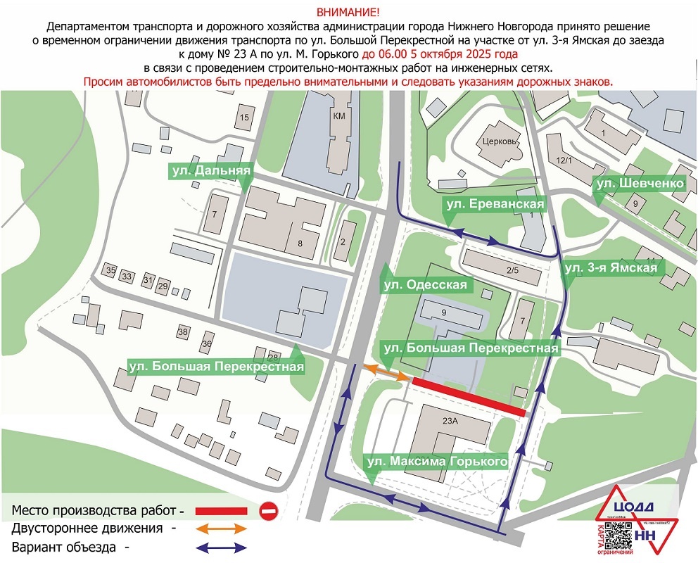 В Нижнем Новгороде временно ограничат движение по улице Большая Перекрёстная. Проезд будет закрыт с 06:00 10 сентября. Об этом сообщает пресс-служба администрации города. Вы ещё не с нами в Telegram? Подписывайтесь, всё самое интересное тут! Ограничения связаны с проведением строительно-монтажных работ, пояснили в мэрии. Движение на участке от улицы 3-я Ямская до заезда к КМ Tower Plaza закроют до утра 5 октября. Для автомобилистов будет организован объезд по прилегающим улицам. Специалисты рекомендуют заранее ознакомиться со схемой движения, соблюдать повышенную осторожность и следовать указаниям дорожных знаков. Напомним, что редакция сайта pravda-nn.ru создала telegram-канал «Проезда нет», где оперативно сообщается об участках перекрытых дорог в Нижнем Новгороде. Подписывайтесь, чтобы быть в курсе! Ранее на сайте pravda-nn.ru сообщили о том, что с 8 сентября проезд на Зеленском съезде частично перекрыт. Ещё новости по теме В переулке Баева и на улице Дальней ограничили движение до к