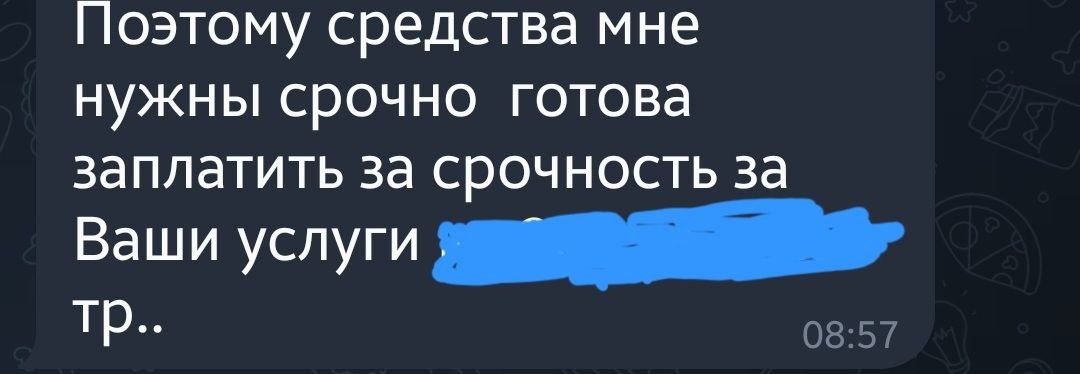 π₯ ΠΡΡΠΎΡΠΈΡ ΠΎΠ΄Π½ΠΎΠΉ ΡΠ΄Π΅Π»ΠΊΠΈ: ΠΊΠ°ΠΊ Π·Π° 1 Π΄Π΅Π½Ρ ΠΏΠΎΠ»ΡΡΠΈΡΡ 7 ΠΌΠΈΠ»Π»ΠΈΠΎΠ½ΠΎΠ² ΡΡΠ±Π»Π΅ΠΉ! ΠΡΠ΅ΡΠ° Π²Π΅ΡΠ΅ΡΠΎΠΌ ΠΊΠΎ ΠΌΠ½Π΅ ΠΎΠ±ΡΠ°ΡΠΈΠ»Π°ΡΡ Π΄Π΅Π²ΡΡΠΊΠ° Ρ ΠΎΡΠ΅Π½Ρ ΡΡΠΎΡΠ½ΠΎΠΉ ΠΏΡΠΎΡΡΠ±ΠΎΠΉ β Π΅ΠΉ ΡΡΠΎΡΠ½ΠΎ ΠΏΠΎΠ½Π°Π΄ΠΎΠ±ΠΈΠ»Π°ΡΡ ΠΊΡΡΠΏΠ½Π°Ρ ΡΡΠΌΠΌΠ°, ΠΏΠΎΡΡΠΈ 7 ΠΌΠΈΠ»Π»ΠΈΠΎΠ½ΠΎΠ² ΡΡΠ±Π»Π΅ΠΉ. ΠΠ½Π° Π±ΡΠ»Π° Π³ΠΎΡΠΎΠ²Π° ΡΠ°ΡΡΠΌΠΎΡΡΠ΅ΡΡ Π²Π°ΡΠΈΠ°Π½Ρ Ρ Π·Π°Π»ΠΎΠ³ΠΎΠΌ. Π― Π·Π°ΠΏΡΠΎΡΠΈΠ» Π΄ΠΎΠΊΡΠΌΠ΅Π½ΡΡ, Π½ΠΎ Π²Π΅ΡΠ΅ΡΠΎΠΌ Π½ΠΈΡΠ΅Π³ΠΎ Π½Π΅ ΠΏΠΎΠ»ΡΡΠΈΠ». Π£ΡΡΠΎΠΌ ΡΠΈΡΡΠ°ΡΠΈΡ ΠΈΠ·ΠΌΠ΅Π½ΠΈΠ»Π°ΡΡ: Π΄Π΅Π²ΡΡΠΊΠ° Π½Π°ΠΏΠΈΡΠ°Π»Π° ΡΠ°Π·Π²Π΅ΡΠ½ΡΡΠΎΠ΅ ΡΠΎΠΎΠ±ΡΠ΅Π½ΠΈΠ΅ Ρ ΠΏΠΎΠ΄ΡΠΎΠ±Π½ΠΎΡΡΡΠΌΠΈ ΠΎ ΡΠΎΠΌ, Π·Π°ΡΠ΅ΠΌ Π΅ΠΉ Π½ΡΠΆΠ½Ρ Π΄Π΅Π½ΡΠ³ΠΈ, ΠΊΡΠΎ ΠΎΠ½Π° ΠΈ ΡΡΠΎ ΠΎΠ½Π°. ΠΠ½Π° Π±ΡΠ»Π° Π³ΠΎΡΠΎΠ²Π° ΠΏΡΠ΅Π΄ΠΎΡΡΠ°Π²ΠΈΡΡ Π΄ΠΎΠΊΡΠΌΠ΅Π½ΡΡ ΠΈ Π΄Π°ΠΆΠ΅ Π΄ΠΎΠΏΠ»Π°ΡΠΈΡΡ Π·Π° ΡΡΠΎΡΠ½ΠΎΡΡΡ. Π 9 ΡΡΡΠ° Ρ Π½Π°ΡΠ°Π» ΠΏΠΎΠ»ΡΡΠ°ΡΡ Π΄ΠΎΠΊΡΠΌΠ΅Π½ΡΡ ΠΈ ΡΡΠ°Π·Ρ ΠΆΠ΅ ΠΎΡΠΏΡΠ°Π²ΠΈΠ» ΠΈΡ