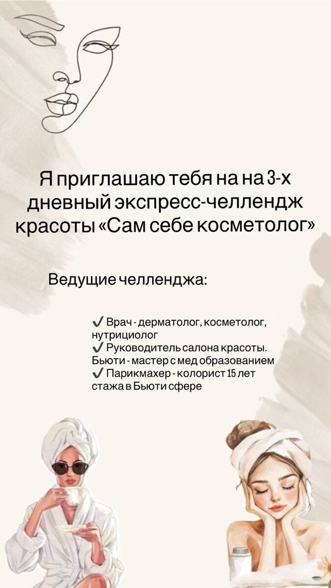 #курс «САМ СЕБЕ КОСМЕТОЛОГ» пошаговый курс ухода за лицом и телом, не выходя из дома Знакомая ситуация? • У вас чувствительная кожа, акне, купероз, пигментация, секутся и выпадают волосы, ногти тонкие или деформированы, а походы по врачам и косметологам не дают результата? • Каждый день вы смотрите в зеркало и видите несовершенства, которые не дают вам чувствовать себя уверенно. • Вы перепробовали множество средств, но проблема всё ещё остаётся? • Боитесь снова отдать большие деньги и не получить результат, а то ещё хуже — получить нежелательную реакцию вашей кожи, ведь такое уже случалось! Мы, эксперты международного проекта «Здоровье без химии» как никто лучше понимаем ваши переживания! Хватит мучиться! Мы приглашаем вас на 3-х дневный экспресс-челлендж красоты «Сам себе косметолог», который поможет вам: ✅Определить истинные причины проблем с кожей, волосами и ногтями ✅Узнать базовые методы коррекции проблем с кожей ✅Подобрать безопасный и эффективный уход ✅Достичь видимых